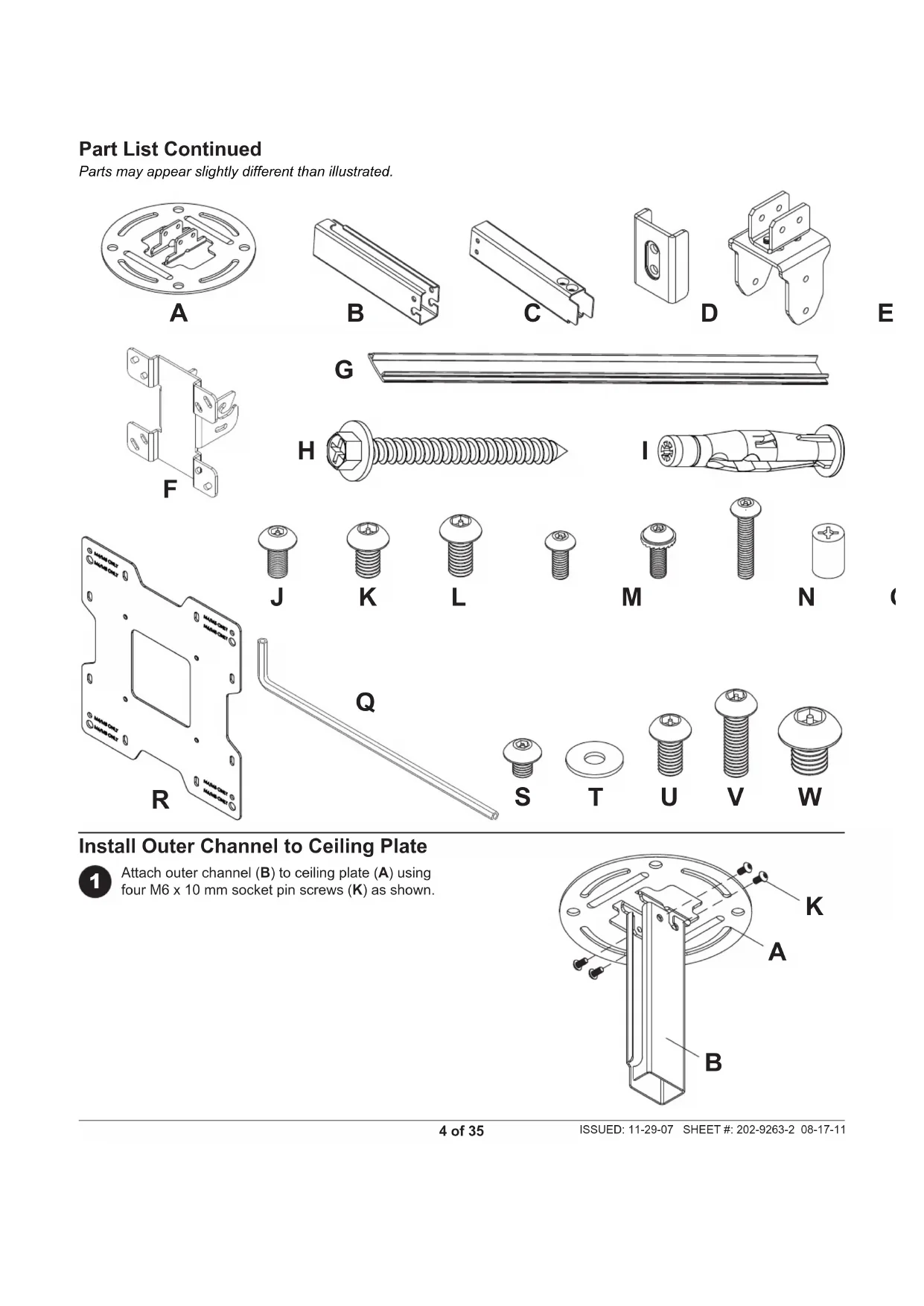 Attach outer channel (B) to ceiling plate (A) using four M6 x 10 mm socket pin screws (K) as shown.