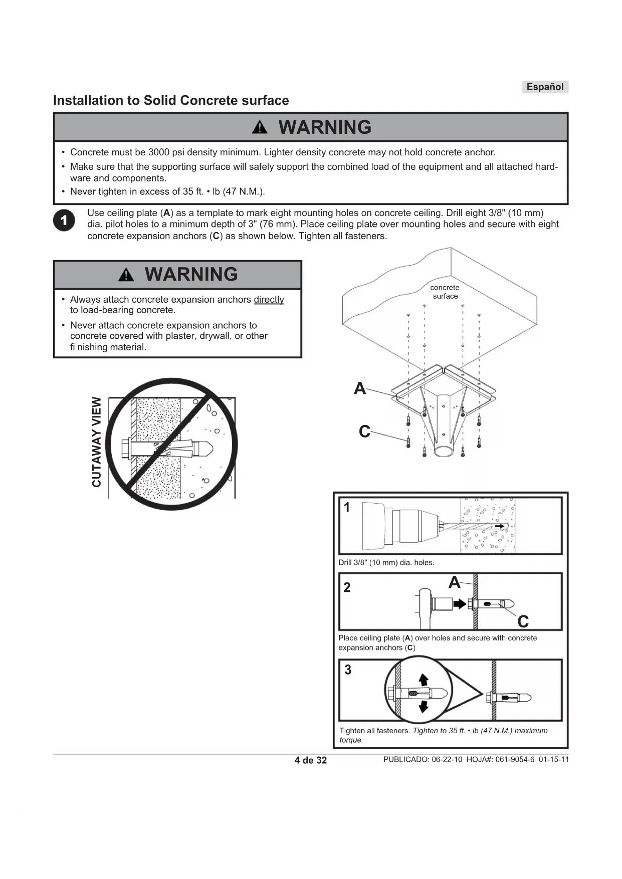 Use ceiling plate (A) as a template to mark eight mounting holes on concrete ceiling. Drill eight 3/8" (10 mm) dia. pilot holes to a minimum depth of 3" (76 mm). Place ceiling plate over mounting holes and secure with eight concrete expansion anchors (C) as shown below. Tighten all fasteners.
