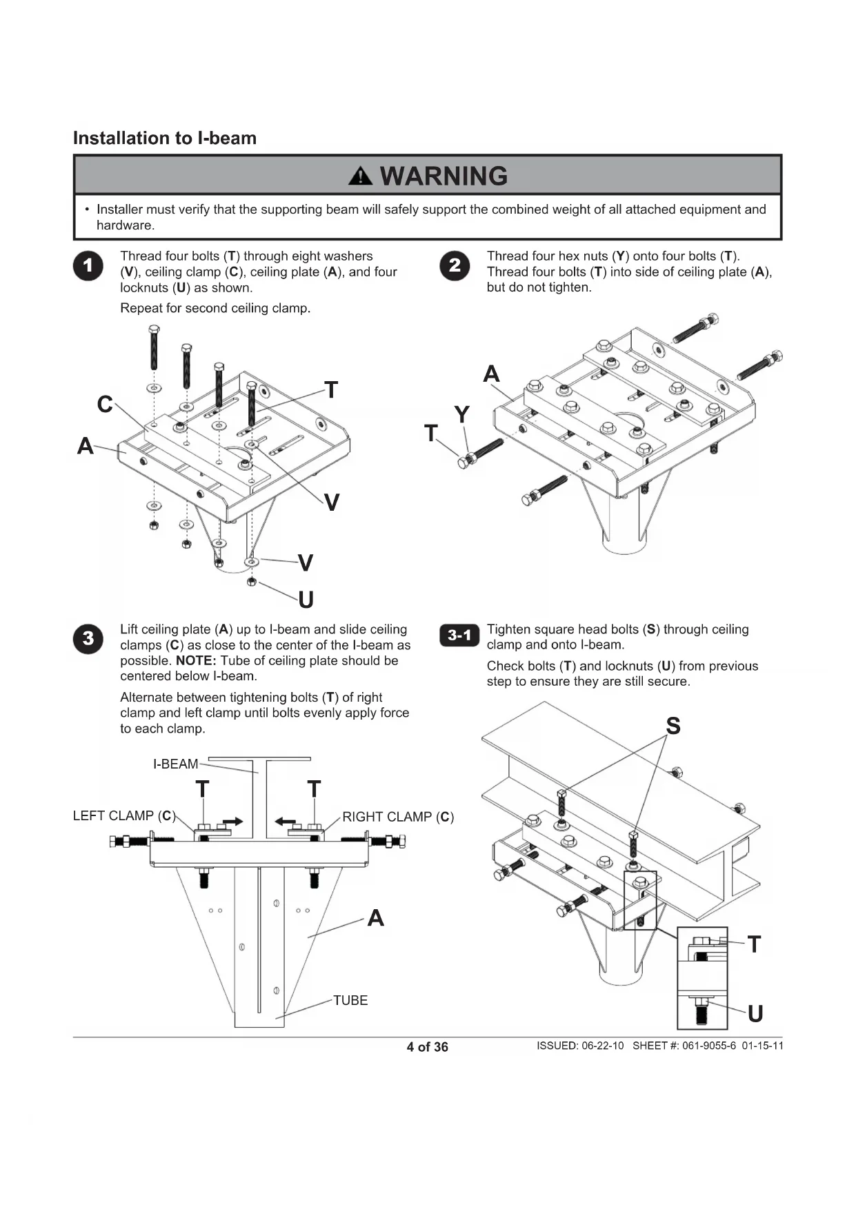 - Installer must verify that the supporting beam will safely support the combined weight of all attached equipment and hardware. WARNING5 of 36 ISSUED: 06-22-10 SHEET #: 061-9055-6 01-15-11 Tighten bolts (T) on sides of ceiling plate assembly just until they touch the ceiling clamp. Tighten hex nuts (Y) until they touch the sides of ceiling plate assembly. Wrap the 5' wire rope (W) tightly around the beam once as shown. Use two cable clips (X) to connect the ends together as shown below. Once cable clips have been attached, the excess cable ends can be removed.