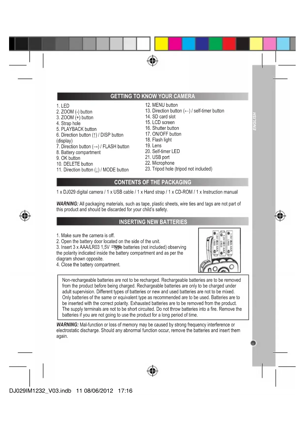 1 x DJ029 digital camera / 1 x USB cable / 1 x Hand strap / 1 x CD-ROM / 1 x Instruction manual