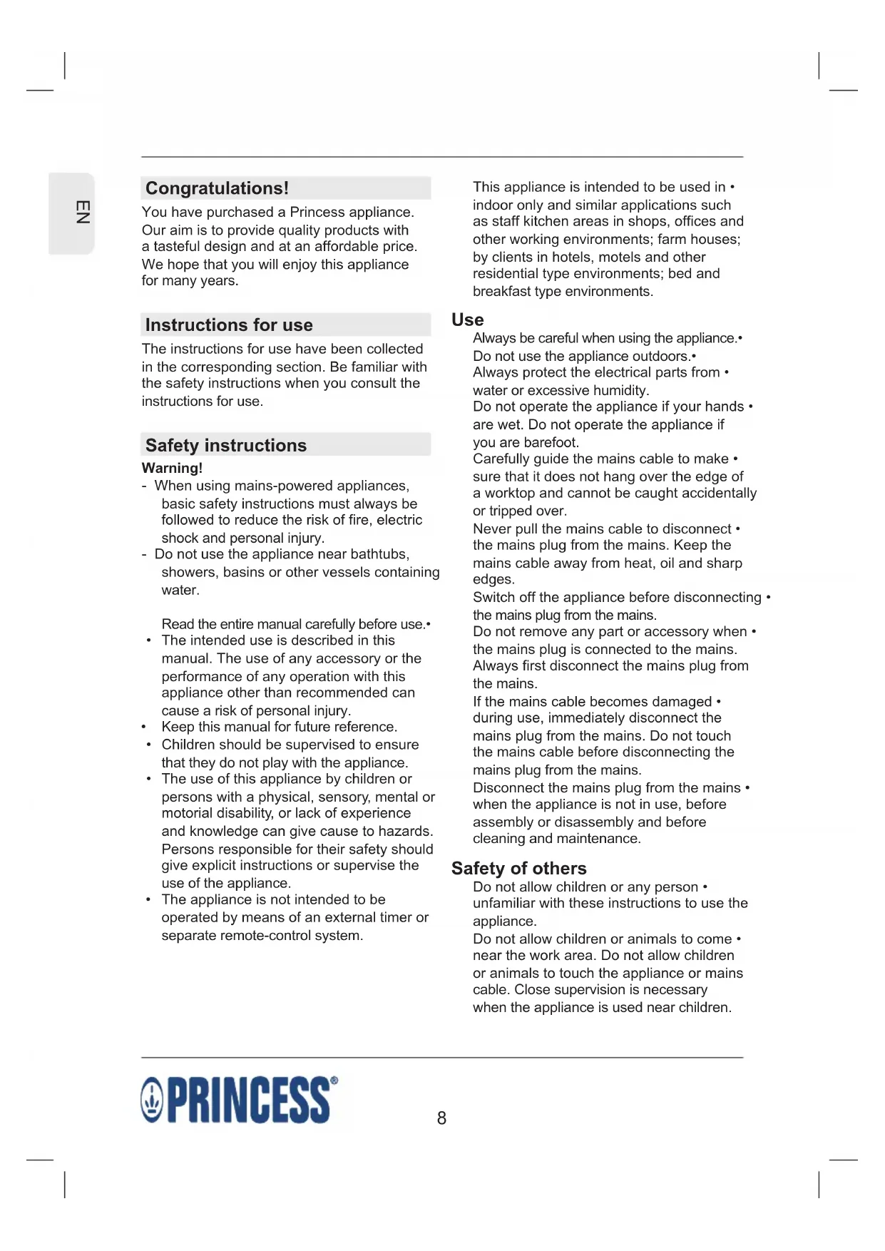 This appliance is intended to be used in • indoor only and similar applications such as staff kitchen areas in shops, offices and other working environments; farm houses; by clients in hotels, motels and other residential type environments; bed and breakfast type environments. Use Always be careful when using the appliance.• Do not use the appliance outdoors.• Always protect the electrical parts from • water or excessive humidity. Do not operate the appliance if your hands • are wet. Do not operate the appliance if you are barefoot. Carefully guide the mains cable to make • sure that it does not hang over the edge of a worktop and cannot be caught accidentally or tripped over. Never pull the mains cable to disconnect • the mains plug from the mains. Keep the mains cable away from heat, oil and sharp edges. Switch off the appliance before disconnecting • the mains plug from the mains. Do not remove any part or accessory when • the mains plug is connected to the mains. Always first disconnect the mains plug from the mains. If the mains cable becomes damaged • during use, immediately disconnect the mains plug from the mains. Do not touch the mains cable before disconnecting the mains plug from the mains. Disconnect the mains plug from the mains • when the appliance is not in use, before assembly or disassembly and before cleaning and maintenance. Safety of others Do not allow children or any person • unfamiliar with these instructions to use the appliance. Do not allow children or animals to come • near the work area. Do not allow children or animals to touch the appliance or mains cable. Close supervision is necessary when the appliance is used near children. Congratulations! You have purchased a Princess appliance. Our aim is to provide quality products with a tasteful design and at an affordable price. We hope that you will enjoy this appliance for many years. Instructions for use The instructions for use have been collected in the corresponding section. Be familiar with the safety instructions when you consult the instructions for use. Safety instructions Warning! - When using mains-powered appliances, basic safety instructions must always be followed to reduce the risk of fire, electric shock and personal injury. - Do not use the appliance near bathtubs, showers, basins or other vessels containing water. Read the entire manual carefully before use.• The intended use is described in this • manual. The use of any accessory or the performance of any operation with this appliance other than recommended can cause a risk of personal injury. Keep this manual for future reference.• Children should be supervised to ensure • that they do not play with the appliance. The use of this appliance by children or • persons with a physical, sensory, mental or motorial disability, or lack of experience and knowledge can give cause to hazards. Persons responsible for their safety should give explicit instructions or supervise the use of the appliance. The appliance is not intended to be • operated by means of an external timer or separate remote-control system.9