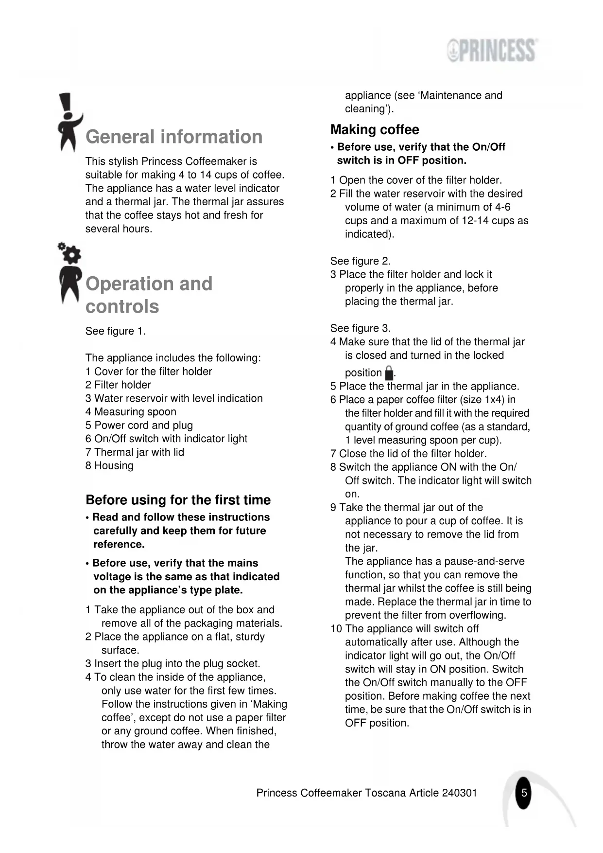 - 2002/96/EC5 Princess Coffeemaker Toscana Article 240301 General information This stylish Princess Coffeemaker is suitable for making 4 to 14 cups of coffee. The appliance has a water level indicator and a thermal jar. The thermal jar assures that the coffee stays hot and fresh for several hours. Operation and controls See figure 1. The appliance includes the following: 1 Cover for the filter holder 2 Filter holder 3 Water reservoir with level indication 4 Measuring spoon 5 Power cord and plug 6 On/Off switch with indicator light 7 Thermal jar with lid 8 Housing Before using for the first time