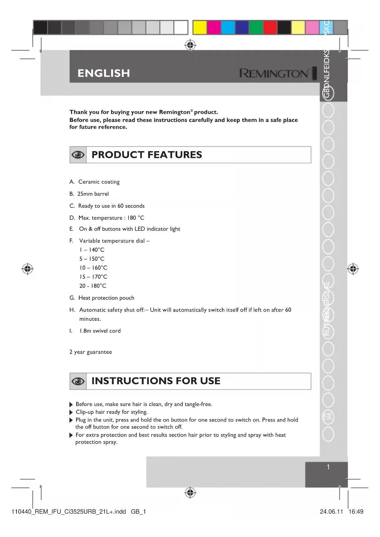 SRB Thank you for buying your new Remington ® product.Before use, please read these instructions carefully and keep them in a safe place for future reference. PRODUCT FEATURES A. Ceramic coatingB. 25mm barrelC. Ready to use in 60 secondsD. Max. temperature : 180 °CE. On & off buttons with LED indicator lightF. Variable temperature dial –1 – 140°C5 – 150°C10 – 160°C15 – 170°C20 - 180°CG. Heat protection pouch H. Automatic safety shut off:– Unit will automatically switch itself off if left on after 60 minutes.I. 1.8m swivel cord2 year guarantee INSTRUCTIONS FOR USE Before use, make sure hair is clean, dry and tangle-free. Clip-up hair ready for styling. Plug in the unit, press and hold the on button for one second to switch on. Press and hold the off button for one second to switch off. For extra protection and best results section hair prior to styling and spray with heat protection spray. 1