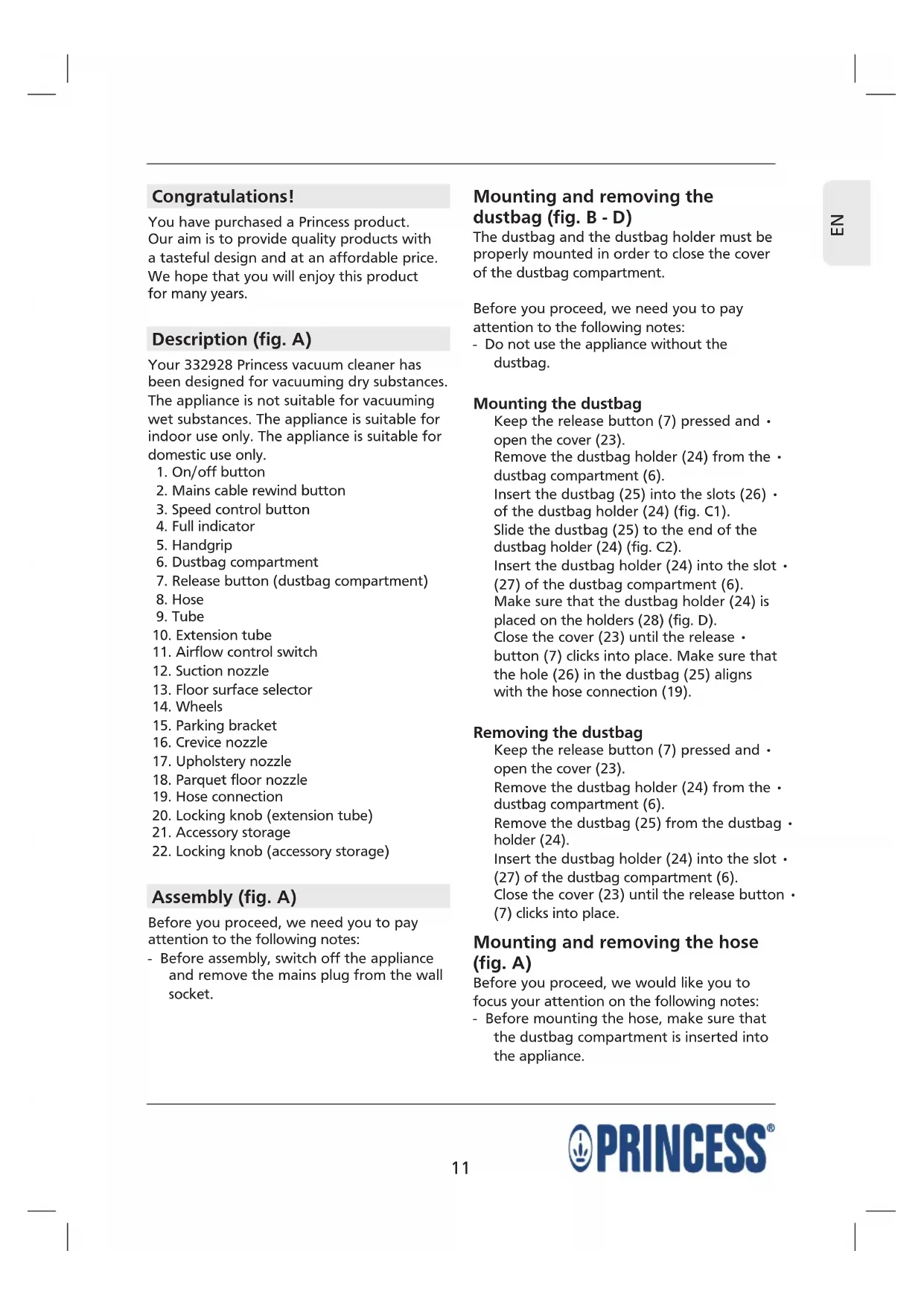 Congratulations! You have purchased a Princess product. Our aim is to provide quality products with a tasteful design and at an affordable price. We hope that you will enjoy this product for many years. Description (fig. A) Your 332928 Princess vacuum cleaner has been designed for vacuuming dry substances. The appliance is not suitable for vacuuming wet substances. The appliance is suitable for indoor use only. The appliance is suitable for domestic use only.