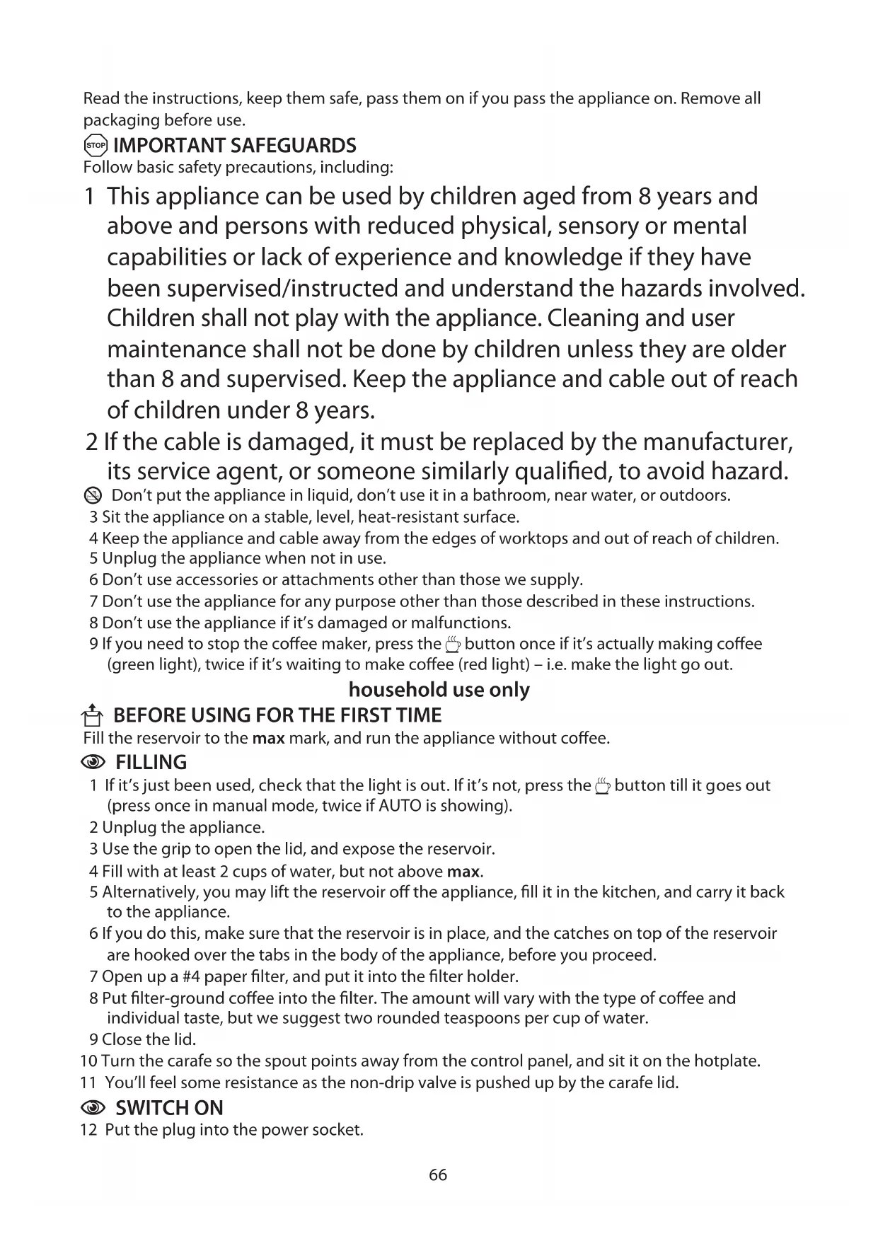 U BEFORE USING FOR THE FIRST TIME Fill the reservoir to the max mark, and run the appliance without coffee.