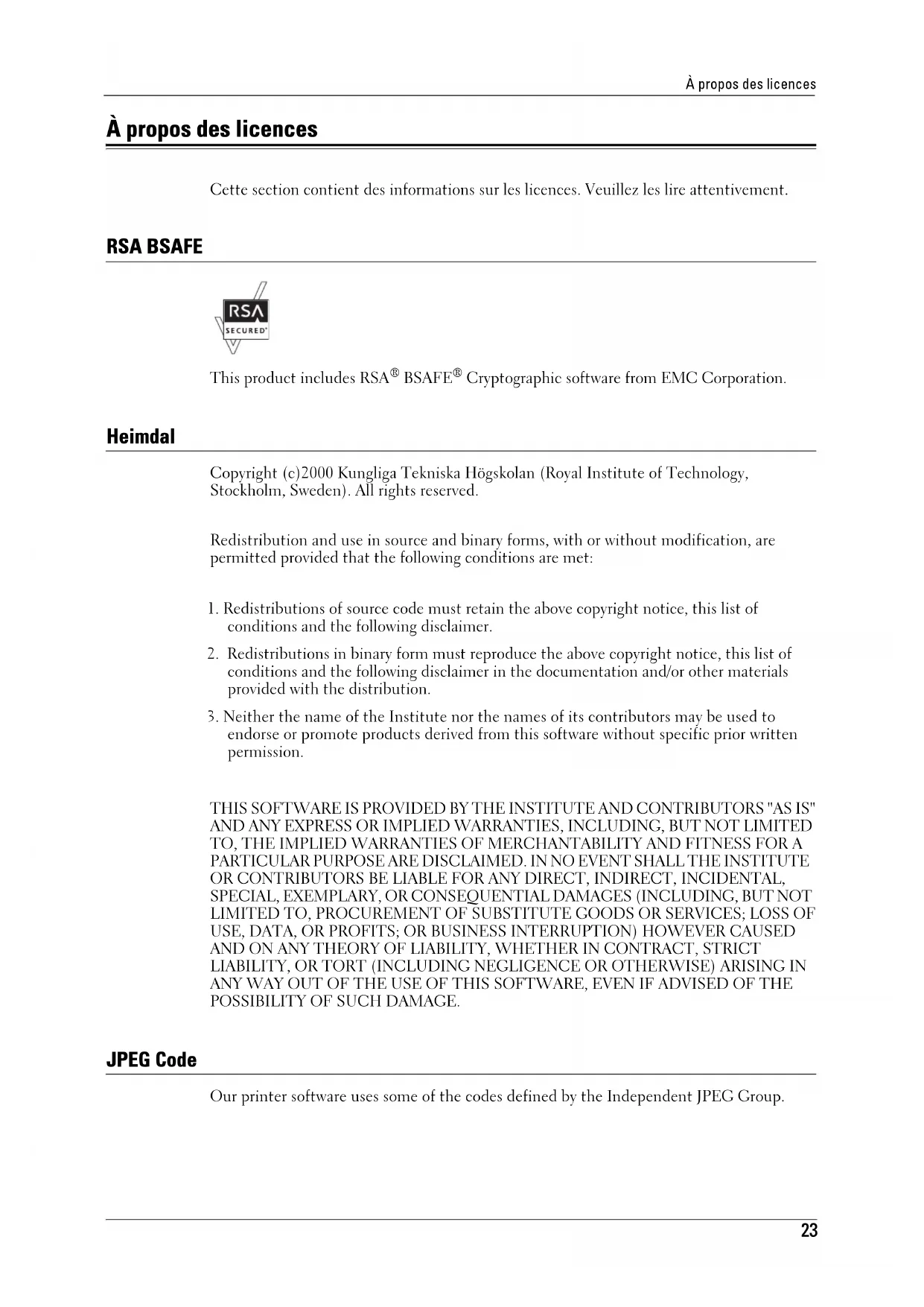 Cryptographic software from EMC Corporation. Heimdal Copyright (c)2000 Kungliga Tekniska Högskolan (Royal Institute of Technology, Stockholm, Sweden). All rights reserved. Redistribution and use in source and binary forms, with or without modification, are permitted provided that the following conditions are met: THIS SOFTWARE IS PROVIDED BY THE INSTITUTE AND CONTRIBUTORS ''AS IS'' AND ANY EXPRESS OR IMPLIED WARRANTIES, INCLUDING, BUT NOT LIMITED TO, THE IMPLIED WARRANTIES OF MERCHANTABILITY AND FITNESS FOR A PARTICULAR PURPOSE ARE DISCLAIMED. IN NO EVENT SHALL THE INSTITUTE OR CONTRIBUTORS BE LIABLE FOR ANY DIRECT, INDIRECT, INCIDENTAL, SPECIAL, EXEMPLARY, OR CONSEQUENTIAL DAMAGES (INCLUDING, BUT NOT LIMITED TO, PROCUREMENT OF SUBSTITUTE GOODS OR SERVICES; LOSS OF USE, DATA, OR PROFITS; OR BUSINESS INTERRUPTION) HOWEVER CAUSED AND ON ANY THEORY OF LIABILITY, WHETHER IN CONTRACT, STRICT LIABILITY, OR TORT (INCLUDING NEGLIGENCE OR OTHERWISE) ARISING IN ANY WAY OUT OF THE USE OF THIS SOFTWARE, EVEN IF ADVISED OF THE POSSIBILITY OF SUCH DAMAGE. JPEG Code Our printer software uses some of the codes defined by the Independent JPEG Group.