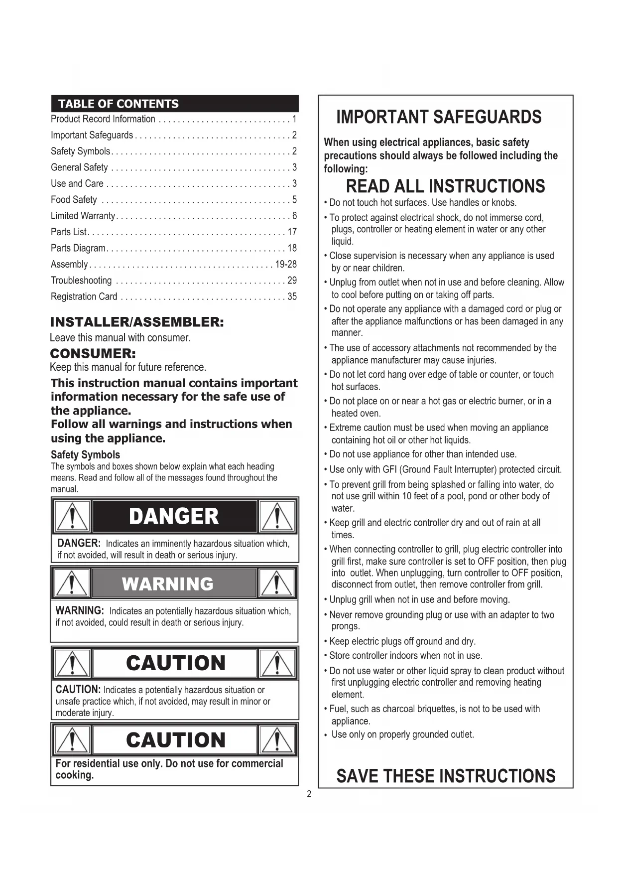 Registration Card . . . . . . . . . . . . . . . . . . . . . . . . . . . . . . . . . . . 35 TABLE OF CONTENTS IMPORTANT SAFEGUARDS When using electrical appliances, basic safety precautions should always be followed including the following: READ ALL INSTRUCTIONS • Do not touch hot surfaces. Use handles or knobs.• To protect against electrical shock, do not immerse cord, plugs, controller or heating element in water or any other liquid.• Close supervision is necessary when any appliance is used by or near children.• Unplug from outlet when not in use and before cleaning. Allow to cool before putting on or taking off parts.• Do not operate any appliance with a damaged cord or plug or after the appliance malfunctions or has been damaged in any manner. • The use of accessory attachments not recommended by the appliance manufacturer may cause injuries.• Do not let cord hang over edge of table or counter, or touch hot surfaces. • Do not place on or near a hot gas or electric burner, or in a heated oven.• Extreme caution must be used when moving an appliance containing hot oil or other hot liquids.• Do not use appliance for other than intended use. • Use only with GFI (Ground Fault Interrupter) protected circuit.• To prevent grill from being splashed or falling into water, do not use grill within 10 feet of a pool, pond or other body of water.• Keep grill and electric controller dry and out of rain at all times.• When connecting controller to grill, plug electric controller into grill first, make sure controller is set to OFF position, then pluginto outlet. When unplugging, turn controller to OFF position, disconnect from outlet, then remove controller from grill.• Unplug grill when not in use and before moving.• Never remove grounding plug or use with an adapter to two prongs.• Keep electric plugs off ground and dry.• Store controller indoors when not in use.• Do not use water or other liquid spray to clean product without first unplugging electric controller and removing heating element.• Fuel, such as charcoal briquettes, is not to be used with appliance. • Use only on properly grounded outlet.