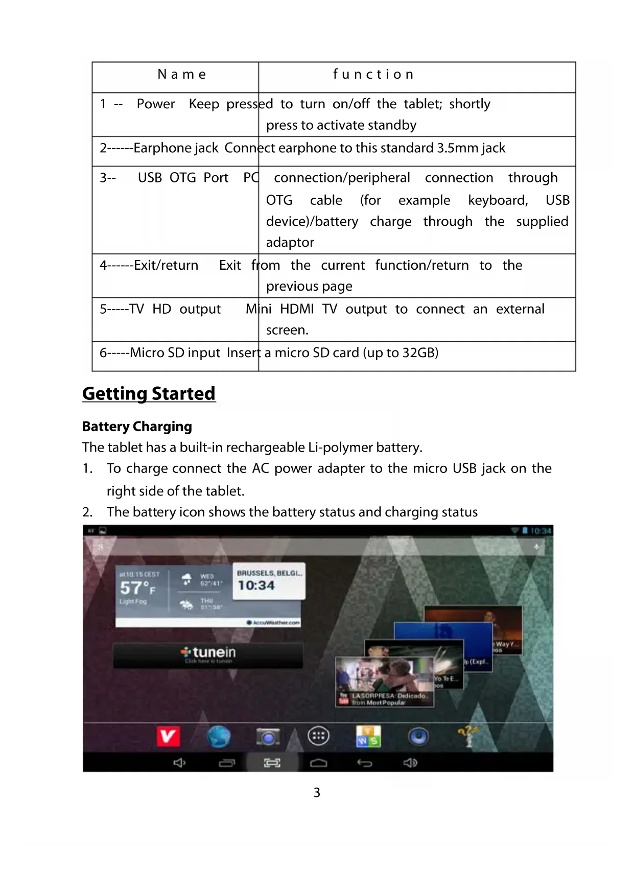| 3-- USB OTG Port PC | connection/peripheral connection through OTG cable (for example keyboard, USB device)/battery charge through the supplied adaptor |