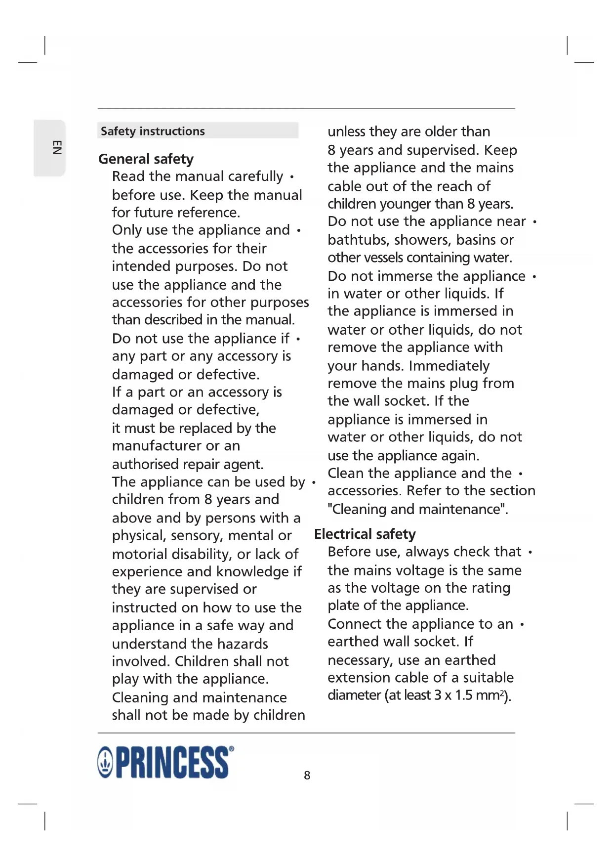 - Do not immerse the appliance in water or