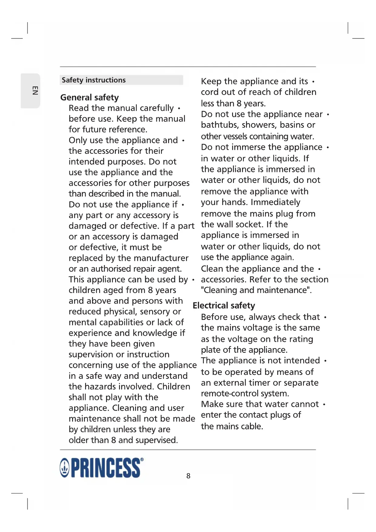Safety instructions General safety Read the manual carefully • before use. Keep the manual for future reference. Only use the appliance and • the accessories for their intended purposes. Do not use the appliance and the accessories for other purposes than described in the manual. Do not use the appliance if • any part or any accessory is damaged or defective. If a part or an accessory is damaged or defective, it must be replaced by the manufacturer or an authorised repair agent. This appliance can be used by • children aged from 8 years and above and persons with reduced physical, sensory or mental capabilities or lack of experience and knowledge if they have been given supervision or instruction concerning use of the appliance in a safe way and understand the hazards involved. Children shall not play with the appliance. Cleaning and user maintenance shall not be made by children unless they are older than 8 and supervised. Keep the appliance and its • cord out of reach of children less than 8 years. Do not use the appliance near • bathtubs, showers, basins or other vessels containing water. Do not immerse the appliance • in water or other liquids. If the appliance is immersed in water or other liquids, do not remove the appliance with your hands. Immediately remove the mains plug from the wall socket. If the appliance is immersed in water or other liquids, do not use the appliance again. Clean the appliance and the • accessories. Refer to the section "Cleaning and maintenance". Electrical safety Before use, always check that • the mains voltage is the same as the voltage on the rating plate of the appliance. The appliance is not intended • to be operated by means of an external timer or separate remote-control system. Make sure that water cannot • enter the contact plugs of the mains cable.9