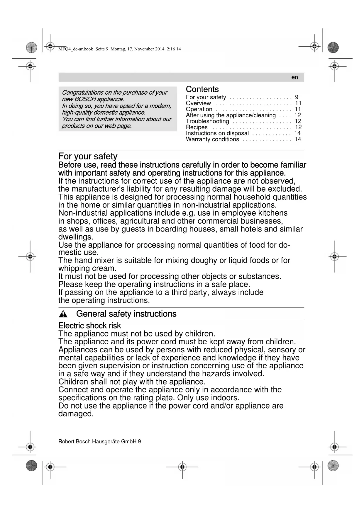 MFQ4_de-ar.book Seite 8 Montag, 17. November 2014 2:16 149Robert Bosch Hausgeräte GmbH 9 Contents For your safety . . . . . . . . . . . . . . . . . . . 9Overview . . . . . . . . . . . . . . . . . . . . . . . 11Operation . . . . . . . . . . . . . . . . . . . . . . . 11After using the appliance/cleaning . . . . 12Troubleshooting . . . . . . . . . . . . . . . . . . 12Recipes . . . . . . . . . . . . . . . . . . . . . . . . 12Instructions on disposal . . . . . . . . . . . . 14Warranty conditions . . . . . . . . . . . . . . . 14 For your safety
