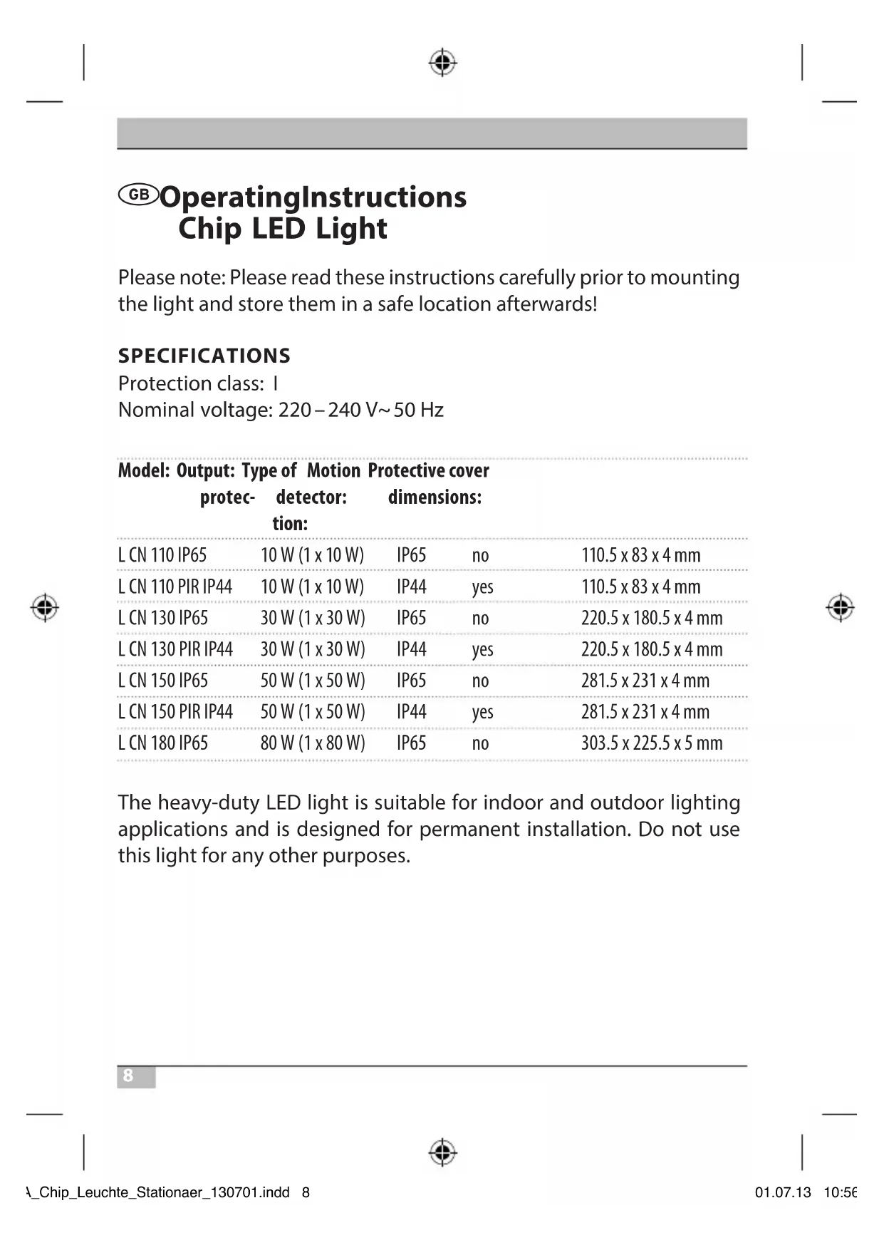 Operating Instructions Chip LED Light Please note: Please read these instructions carefully prior to mounting the light and store them in a safe location afterwards! SPECIFICATIONS Protection class: I Nominal voltage: 220 – 240V~ 50Hz Model: Output: Type of Motion Protective cover protec- detector: dimensions: tion: L CN 110 IP65 10W (1 x 10W) IP65 no 110.5 x 83 x 4mm L CN 110 PIR IP44 10W (1 x 10W) IP44 yes 110.5 x 83 x 4mm L CN 130 IP65 30W (1 x 30W) IP65 no 220.5 x 180.5 x 4mm L CN 130 PIR IP44 30W (1 x 30W) IP44 yes 220.5 x 180.5 x 4mm L CN 150 IP65 50W (1 x 50W) IP65 no 281.5 x 231 x 4mm L CN 150 PIR IP44 50W (1 x 50W) IP44 yes 281.5 x 231 x 4mm L CN 180 IP65 80W (1 x 80W) IP65 no 303.5 x 225.5 x 5mm The heavy-duty LED light is suitable for indoor and outdoor lighting applications and is designed for permanent installation. Do not use this light for any other purposes. BA_Chip_Leuchte_Stationaer_130701.indd 8 01.07.13 10:569