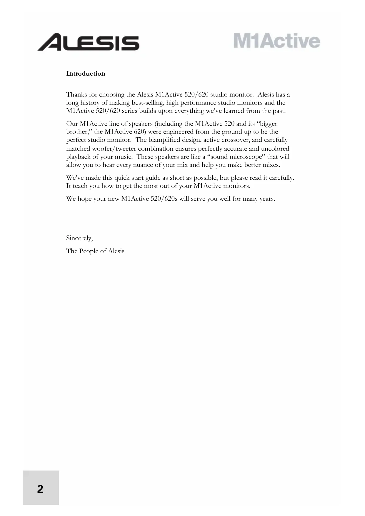 M1Active 520/620 Quick Start User’s Guide (English)2 Introduction Thanks for choosing the Alesis M1Active 520/620 studio monitor. Alesis has a long history of making best-selling, high performance studio monitors and the M1Active 520/620 series builds upon everything we’ve learned from the past. Our M1Active line of speakers (including the M1Active 520 and its “bigger brother,” the M1Active 620) were engineered from the ground up to be the perfect studio monitor. The biamplified design, active crossover, and carefully matched woofer/tweeter combination ensures perfectly accurate and uncolored playback of your music. These speakers are like a “sound microscope” that will allow you to hear every nuance of your mix and help you make better mixes. We’ve made this quick start guide as short as possible, but please read it carefully. It teach you how to get the most out of your M1Active monitors. We hope your new M1Active 520/620s will serve you well for many years.