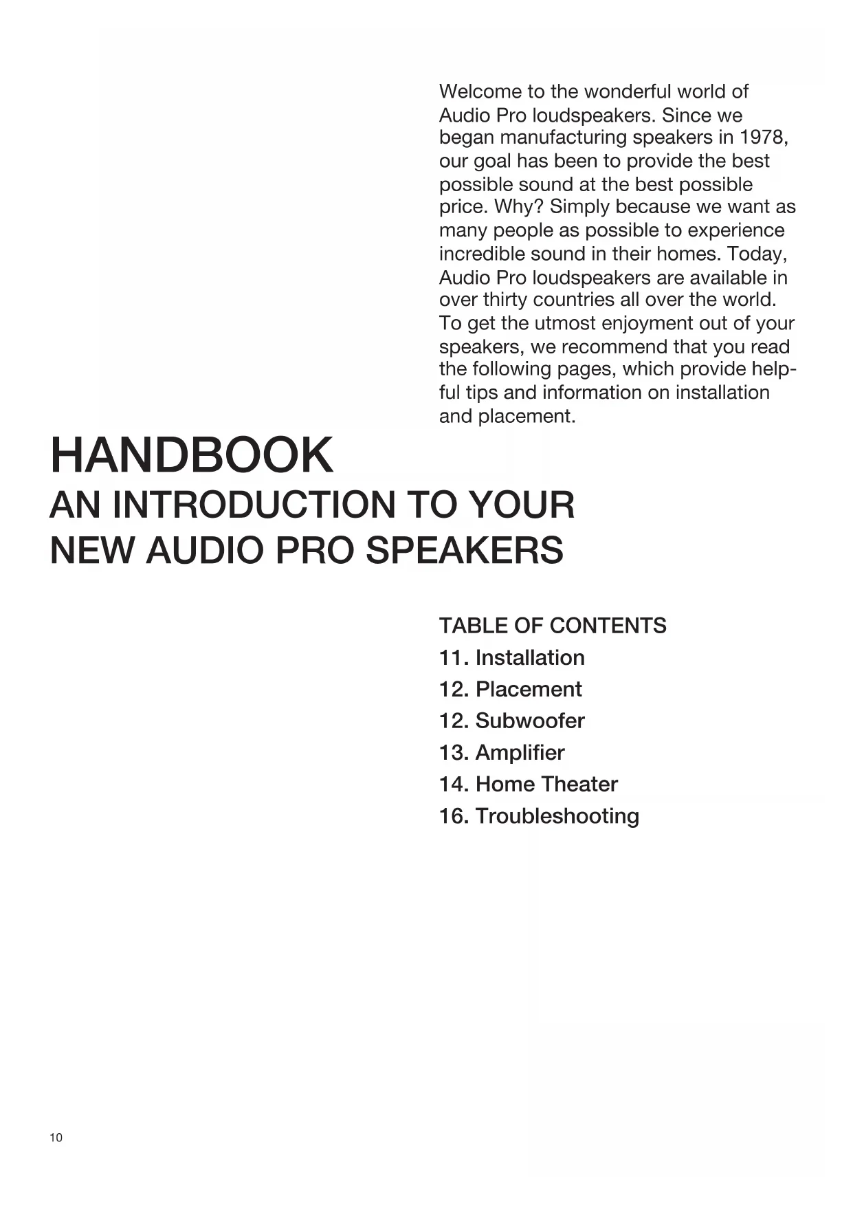 Dålig bas och/eller diffus stereobild. Förstärkaren slår ifrån.910 Welcome to the wonderful world of Audio Pro loudspeakers. Since we began manufacturing speakers in 1978, our goal has been to provide the best possible sound at the best possible price. Why? Simply because we want as many people as possible to experience incredible sound in their homes. Today, Audio Pro loudspeakers are available in over thirty countries all over the world. To get the utmost enjoyment out of your speakers, we recommend that you read the following pages, which provide help- ful tips and information on installation and placement.