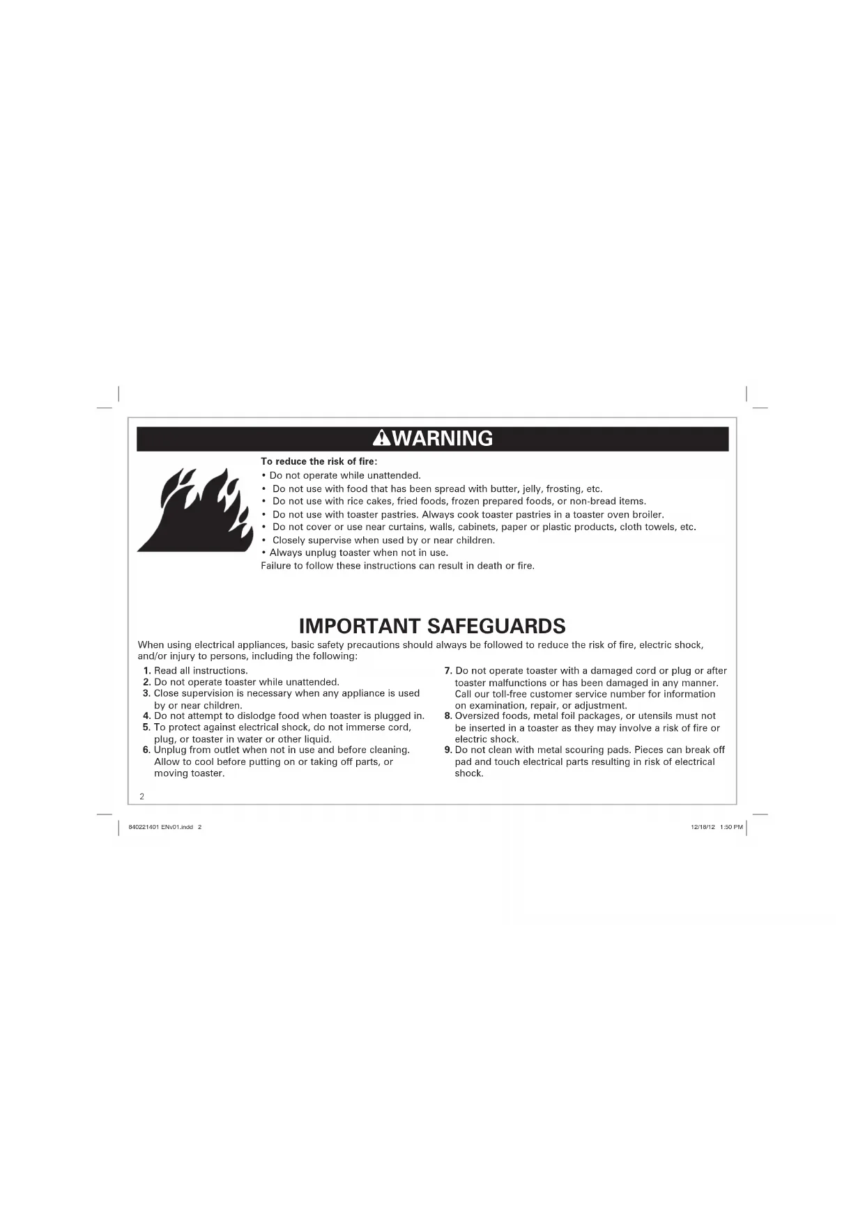 w WARNING Your toaster should be cleaned regularly for best performance and long life. Regular cleaning will also reduce the risk of fire hazard.