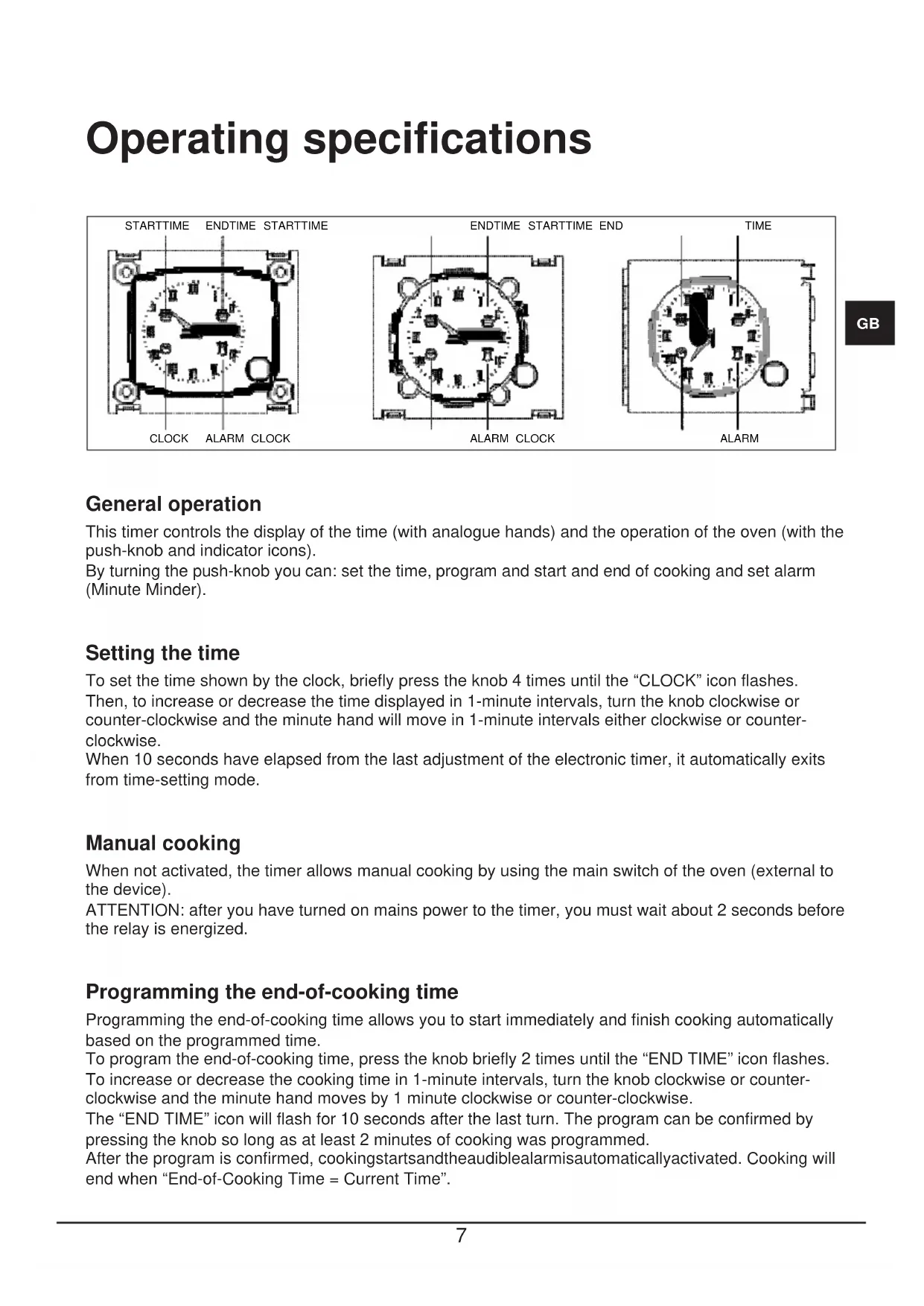 General operation This timer controls the display of the time (with analogue hands) and the operation of the oven (with the push-knob and indicator icons). By turning the push-knob you can: set the time, program and start and end of cooking and set alarm (Minute Minder).