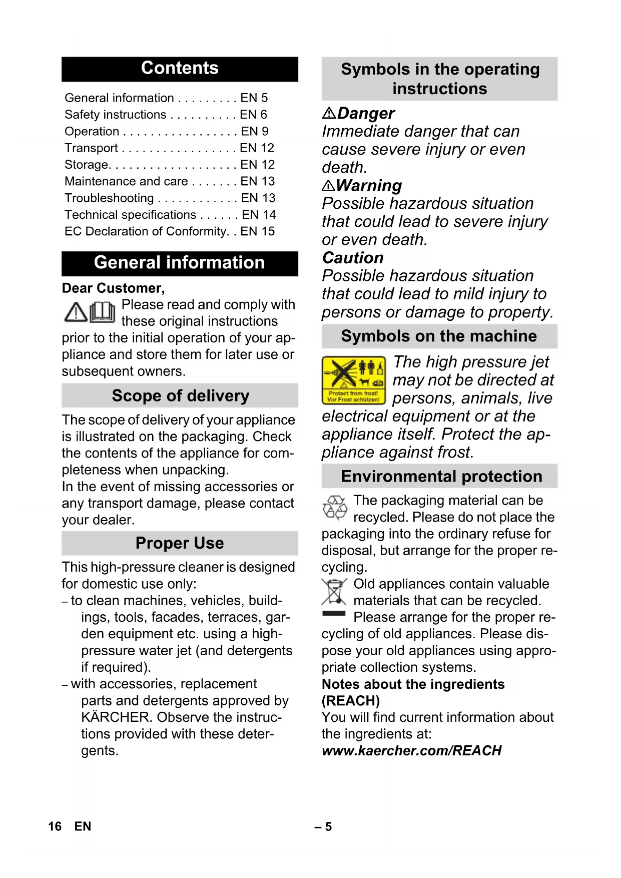 EN 61000–3–3: 2008 EN 62233: 2008 Angewandtes Konformitätsbewer- tungsverfahren 2000/14/EG: Anhang V Schallleistungspegel dB(A) Gemessen: 87 Garantiert: 90 CEO Head of Approbation Winnenden, 2013/07/01 15DE– 5 Dear Customer, Please read and comply with these original instructions prior to the initial operation of your ap- pliance and store them for later use or subsequent owners. The scope of delivery of your appliance is illustrated on the packaging. Check the contents of the appliance for com- pleteness when unpacking. In the event of missing accessories or any transport damage, please contact your dealer. This high-pressure cleaner is designed for domestic use only: – to clean machines, vehicles, build- ings, tools, facades, terraces, gar- den equipment etc. using a high- pressure water jet (and detergents if required). – with accessories, replacement parts and detergents approved by KÄRCHER. Observe the instruc- tions provided with these deter- gents. Danger Immediate danger that can cause severe injury or even death. 몇 Warning Possible hazardous situation that could lead to severe injury or even death. Caution Possible hazardous situation that could lead to mild injury to persons or damage to property. The high pressure jet may not be directed at persons, animals, live electrical equipment or at the appliance itself. Protect the ap- pliance against frost. The packaging material can be recycled. Please do not place the packaging into the ordinary refuse for disposal, but arrange for the proper re- cycling. Old appliances contain valuable materials that can be recycled. Please arrange for the proper re- cycling of old appliances. Please dis- pose your old appliances using appro- priate collection systems. Notes about the ingredients (REACH) You will find current information about the ingredients at: www.kaercher.com/REACH Contents General information ... EN 5 Safety instructions ... EN 6 Operation ... EN 9 Transport ... EN 12 Storage... EN 12 Maintenance and care ... EN 13 Troubleshooting ... EN 13 Technical specifications ... EN 14 EC Declaration of Conformity... EN 15 General information Scope of delivery Proper Use Symbols in the operating instructions Symbols on the machine Environmental protection 16 EN– 6 The warranty terms published by the relevant sales company are applicable in each country. We will repair potential failures of your appliance within the warranty period free of charge, provid- ed that such failure is caused by faulty material or defects in manufacturing. In the event of a warranty claim please contact your dealer or the nearest au- thorized Customer Service centre. Please submit the proof of purchase. (See address on the reverse) Danger Never touch the mains plug and the socket with wet hands. The appliance must not be used if the power cord or im- portant parts of the appliance, e.g. high pressure hoses, trig- ger gun or safety devices are damaged. Check the power cord and mains plug for damage be- fore every use. If the power cord is damaged, please ar- range for it to be replaced im- mediately by an authorised repair agent or a skilled elec- trician. Check the high pressure hose for damage before eve- ry use. Please arrange for the immediate replacement of a damaged high pressure hose. The appliance may not be used in areas where a risk of explosion is present. If the appliance is used in hazardous areas (e.g. filling stations) all of the safety pro- visions and operating instruc- tions detailed in this manual must be observed. High pressure jets can be dangerous if improperly used. The jet must not be directed at persons, animals, live elec- trical equipment or at the ap- pliance itself. The high pressure jet must not be directed at other per- sons or directed by the user at him/herself to clean cloth- ing or footwear. Never use the appliance to clean objects containing haz- ardous substances (e.g. as- bestos). Vehicle tyres or tyre valves are susceptible to damage from the high pressure jet and may burst. The first indication of this is a discolouration of the tyre. Damaged vehicle tyres/tyre valves are highly dangerous. Ensure that a dis- tance of at least 30 cm is ob- served when cleaning with the jet! Risk of explosion! Do not spray flammable liquids. Never draw in fluids contain- ing solvents or undiluted ac- ids! This includes petrol, paint thinner and heating oil. The spray mist thus generated is highly inflammable, explosive and poisonous. Warranty Safety instructions 17EN– 7 Do not use acetone, undilut- ed acids or solvents as they are damaging to the materials from which the appliance is made. 몇 Warning The mains plug and the cou- pling of an extension cable must be watertight and must never lie in water. Moreover, the coupling may never lie on the ground. The use of cable reels that ensure that the sockets are at least 60 mm above the ground is recom- mended. Unsuitable electrical exten- sion cables can be hazard- ous. Only use electrical ex- tension cables outdoors which have been approved and labelled for this purpose and have an adequate cable cross-section: 1 -10 m: 1.5