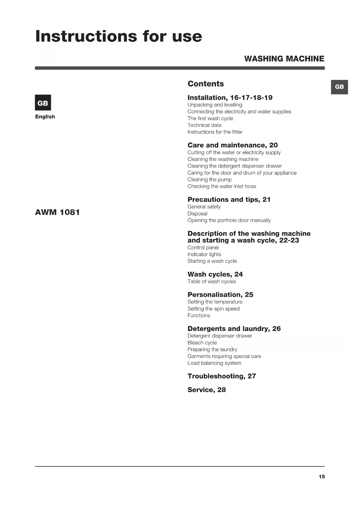 USER MANUAL AWM 1081 EU HOTPOINT