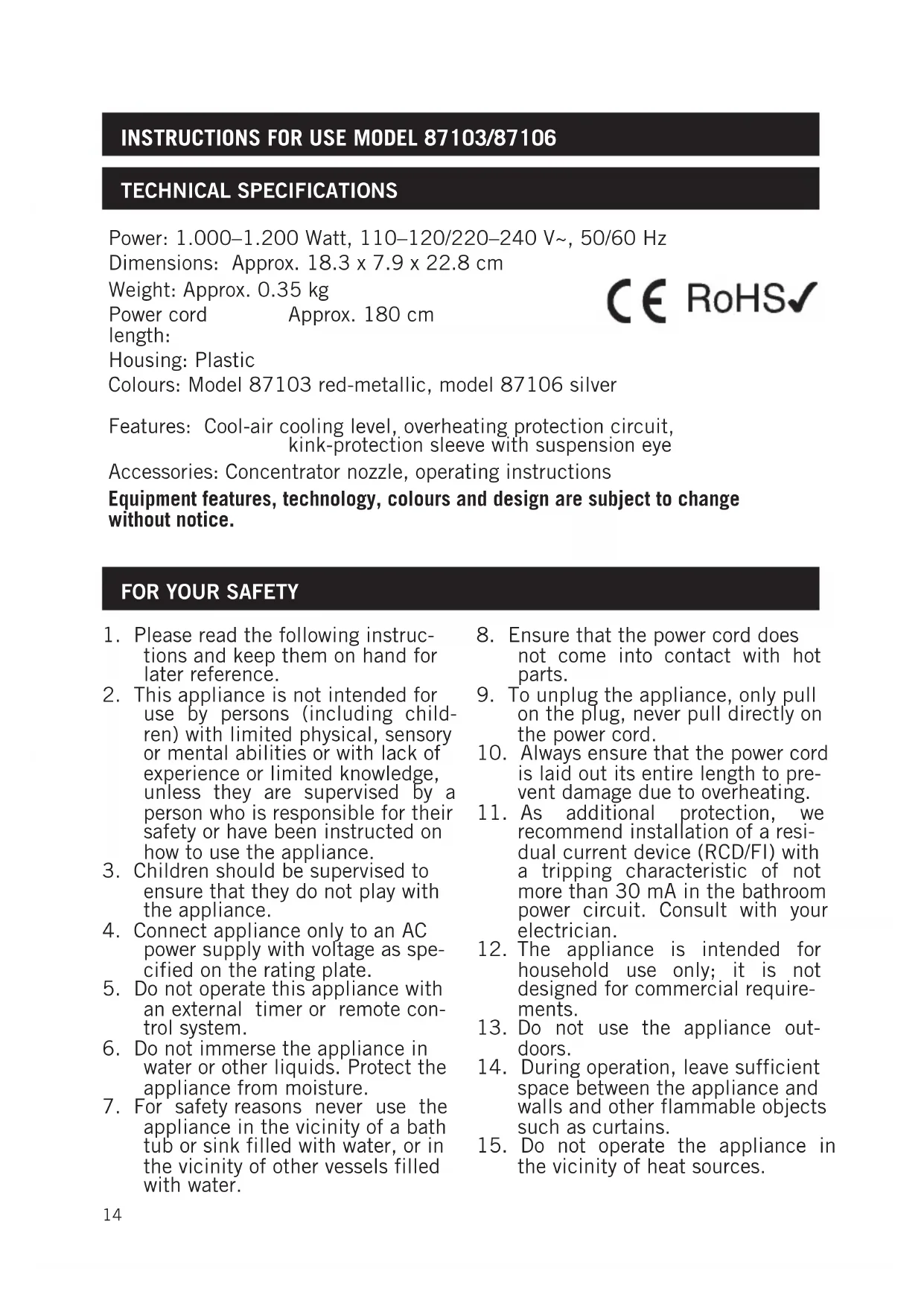 Instructions for use Model 87103/87106