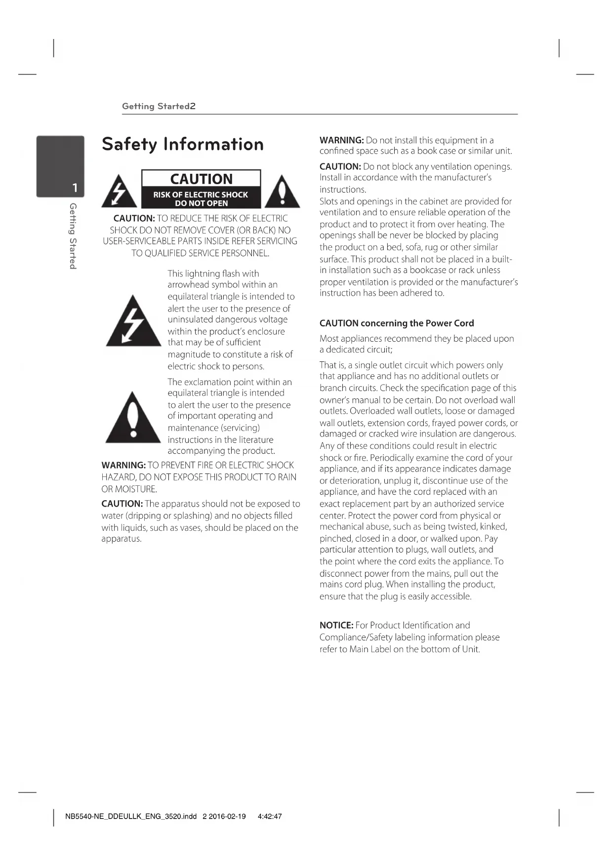 conned space such as a book case or similar unit. CAUTION: Do not block any ventilation openings. Install in accordance with the manufacturer’s instructions. Slots and openings in the cabinet are provided for ventilation and to ensure reliable operation of the product and to protect it from over heating. The openings shall be never be blocked by placing the product on a bed, sofa, rug or other similar surface. This product shall not be placed in a built- in installation such as a bookcase or rack unless proper ventilation is provided or the manufacturer’s instruction has been adhered to. CAUTION concerning the Power Cord Most appliances recommend they be placed upon a dedicated circuit; That is, a single outlet circuit which powers only that appliance and has no additional outlets or branch circuits. Check the specication page of this owner’s manual to be certain. Do not overload wall outlets. Overloaded wall outlets, loose or damaged wall outlets, extension cords, frayed power cords, or damaged or cracked wire insulation are dangerous. Any of these conditions could result in electric shock or re. Periodically examine the cord of your appliance, and if its appearance indicates damage or deterioration, unplug it, discontinue use of the appliance, and have the cord replaced with an exact replacement part by an authorized service center. Protect the power cord from physical or mechanical abuse, such as being twisted, kinked, pinched, closed in a door, or walked upon. Pay particular attention to plugs, wall outlets, and the point where the cord exits the appliance. To disconnect power from the mains, pull out the mains cord plug. When installing the product, ensure that the plug is easily accessible. NOTICE: For Product Identication and Compliance/Safety labeling information please refer to Main Label on the bottom of Unit. NB5540-NE_DDEULLK_ENG_3520.indd 2 2016-02-19 4:42:47Getting Started 3 Getting Started