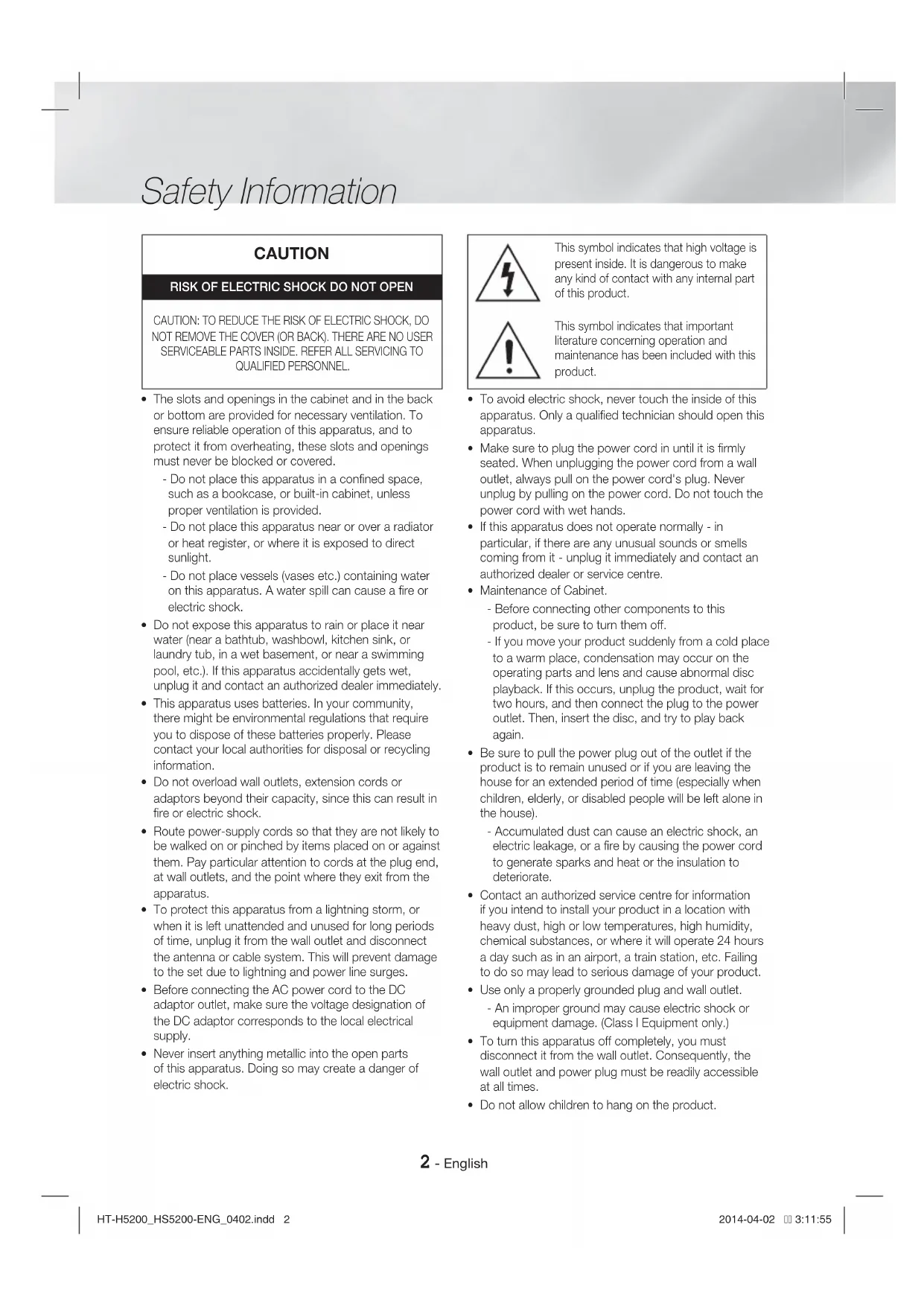 Safety Information • The slots and openings in the cabinet and in the back or bottom are provided for necessary ventilation. To ensure reliable operation of this apparatus, and to protect it from overheating, these slots and openings must never be blocked or covered. - Do not place this apparatus in a confined space, such as a bookcase, or built-in cabinet, unless proper ventilation is provided. - Do not place this apparatus near or over a radiator or heat register, or where it is exposed to direct sunlight. - Do not place vessels (vases etc.) containing water on this apparatus. A water spill can cause a fire or electric shock.• Do not expose this apparatus to rain or place it near water (near a bathtub, washbowl, kitchen sink, or laundry tub, in a wet basement, or near a swimming pool, etc.). If this apparatus accidentally gets wet, unplug it and contact an authorized dealer immediately.• This apparatus uses batteries. In your community, there might be environmental regulations that require you to dispose of these batteries properly. Please contact your local authorities for disposal or recycling information.• Do not overload wall outlets, extension cords or adaptors beyond their capacity, since this can result in fire or electric shock.• Route power-supply cords so that they are not likely to be walked on or pinched by items placed on or against them. Pay particular attention to cords at the plug end, at wall outlets, and the point where they exit from the apparatus.• To protect this apparatus from a lightning storm, or when it is left unattended and unused for long periods of time, unplug it from the wall outlet and disconnect the antenna or cable system. This will prevent damage to the set due to lightning and power line surges.• Before connecting the AC power cord to the DC adaptor outlet, make sure the voltage designation of the DC adaptor corresponds to the local electrical supply.• Never insert anything metallic into the open parts of this apparatus. Doing so may create a danger of electric shock.• To avoid electric shock, never touch the inside of this apparatus. Only a qualified technician should open this apparatus.• Make sure to plug the power cord in until it is firmly seated. When unplugging the power cord from a wall outlet, always pull on the power cord's plug. Never unplug by pulling on the power cord. Do not touch the power cord with wet hands.• If this apparatus does not operate normally - in particular, if there are any unusual sounds or smells coming from it - unplug it immediately and contact an authorized dealer or service centre.• Maintenance of Cabinet. - Before connecting other components to this product, be sure to turn them off. - If you move your product suddenly from a cold place to a warm place, condensation may occur on the operating parts and lens and cause abnormal disc playback. If this occurs, unplug the product, wait for two hours, and then connect the plug to the power outlet. Then, insert the disc, and try to play back again.• Be sure to pull the power plug out of the outlet if the product is to remain unused or if you are leaving the house for an extended period of time (especially when children, elderly, or disabled people will be left alone in the house). - Accumulated dust can cause an electric shock, an electric leakage, or a fire by causing the power cord to generate sparks and heat or the insulation to deteriorate.• Contact an authorized service centre for information if you intend to install your product in a location with heavy dust, high or low temperatures, high humidity, chemical substances, or where it will operate 24 hours a day such as in an airport, a train station, etc. Failing to do so may lead to serious damage of your product.• Use only a properly grounded plug and wall outlet. - An improper ground may cause electric shock or equipment damage. (Class l Equipment only.)• To turn this apparatus off completely, you must disconnect it from the wall outlet. Consequently, the wall outlet and power plug must be readily accessible at all times.• Do not allow children to hang on the product. CAUTION RISK OF ELECTRIC SHOCK DO NOT OPENCAUTION: TO REDUCE THE RISK OF ELECTRIC SHOCK, DO NOT REMOVE THE COVER (OR BACK). THERE ARE NO USER SERVICEABLE PARTS INSIDE. REFER ALL SERVICING TO QUALIFIED PERSONNEL.This symbol indicates that high voltage is present inside. It is dangerous to make any kind of contact with any internal part of this product.This symbol indicates that important literature concerning operation and maintenance has been included with this product. HT-H5200_HS5200-ENG_0402.indd 2HT-H5200_HS5200-ENG_0402.indd 2 2014-04-02 3:11:552014-04-02 3:11:553 - English