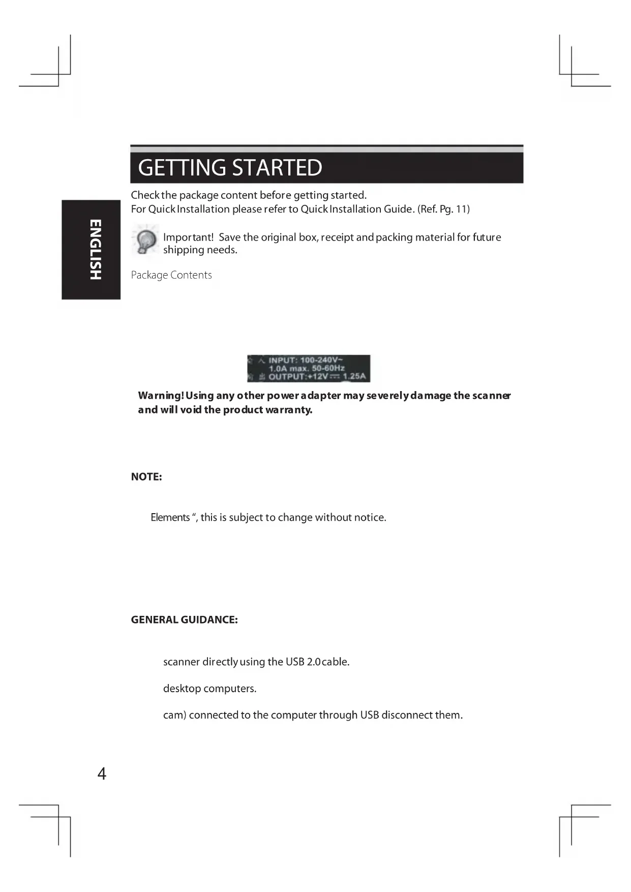 Warning! Using any other power adapter may severely damage the scanner and will void the product warranty.