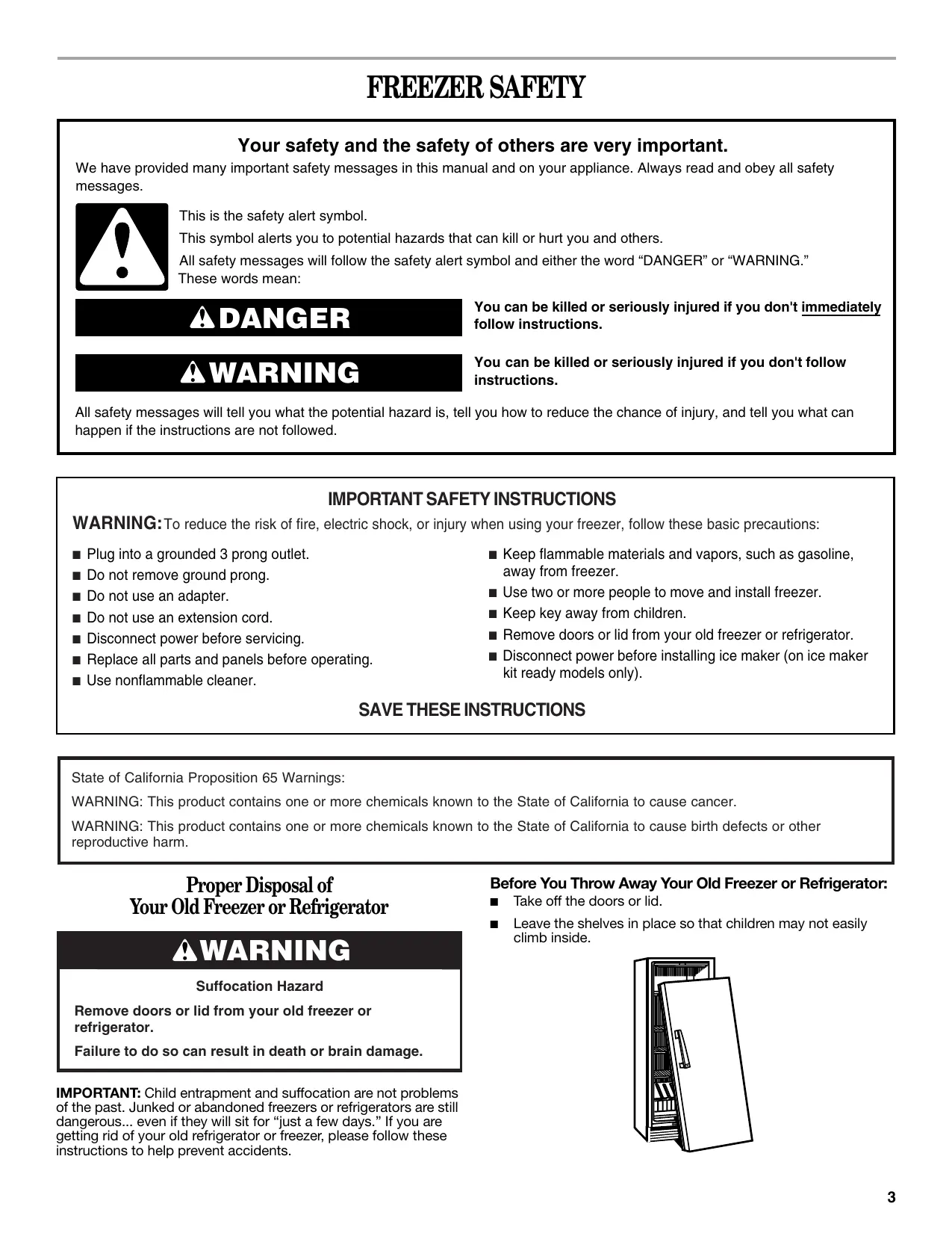 Leave the shelves in place so that children may not easily climb inside. Suffocation Hazard Remove doors or lid from your old freezer or refrigerator. Failure to do so can result in death or brain damage. IMPORTANT: Child entrapment and suffocation are not problems of the past. Junked or abandoned freezers or refrigerators are still dangerous... even if they will sit for “just a few days.” If you are getting rid of your old refrigerator or freezer, please follow these instructions to help prevent accidents.