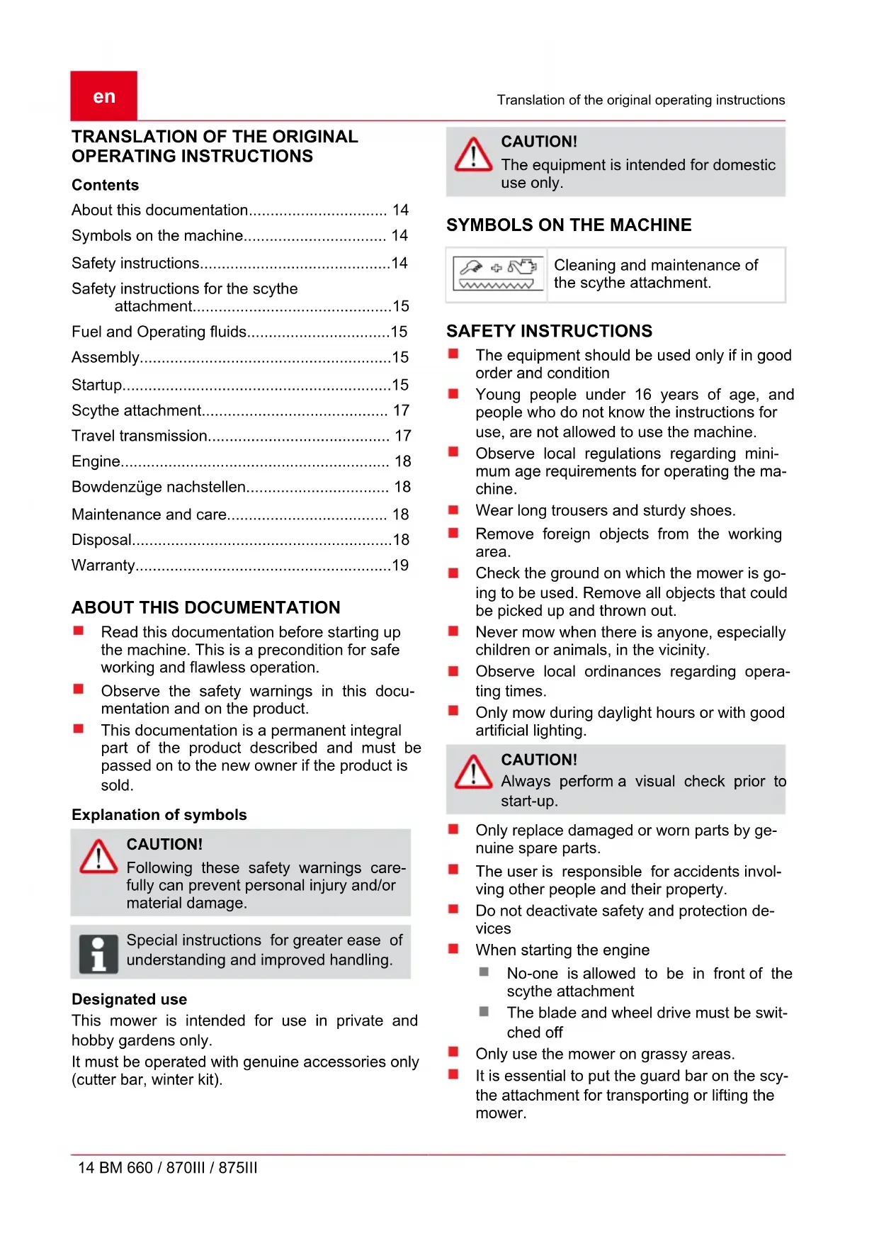 14 BM 660 / 870III / 875III TRANSLATION OF THE ORIGINAL OPERATING INSTRUCTIONS Contents
