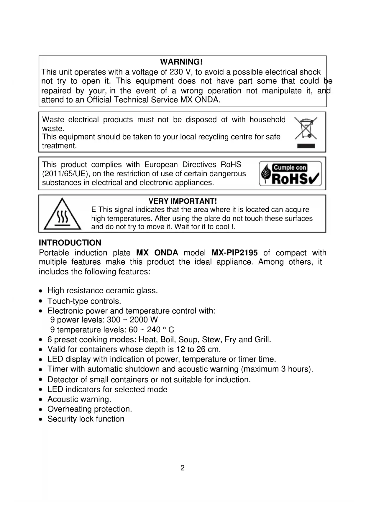 VERY IMPORTANT! E This signal indicates that the area where it is located can acquire high temperatures. After using the plate do not touch these surfaces and do not try to move it. Wait for it to cool !. INTRODUCTION Portable induction plate MX ONDA model MX-PIP2195 of compact with multiple features make this product the ideal appliance. Among others, it includes the following features: High resistance ceramic glass. Touch-type controls. Electronic power and temperature control with: 9 power levels: 300 ~ 2000 W 9 temperature levels: 60 ~ 240 ° C 6 preset cooking modes: Heat, Boil, Soup, Stew, Fry and Grill. Valid for containers whose depth is 12 to 26 cm. LED display with indication of power, temperature or timer time. Timer with automatic shutdown and acoustic warning (maximum 3 hours). Detector of small containers or not suitable for induction. LED indicators for selected mode Acoustic warning. Overheating protection. Security lock function