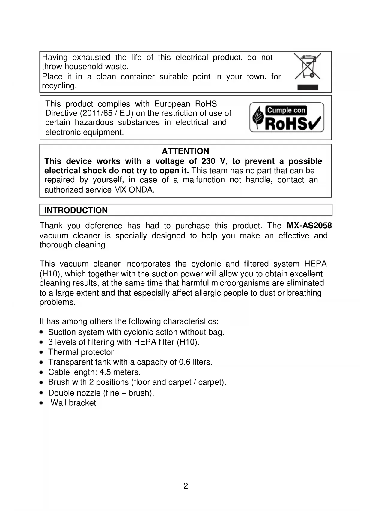 This product complies with European RoHS Directive (2011/65 / EU) on the restriction of use of certain hazardous substances in electrical and electronic equipment. ATTENTION This device works with a voltage of 230 V, to prevent a possible electrical shock do not try to open it. This team has no part that can be repaired by yourself, in case of a malfunction not handle, contact an authorized service MX ONDA. INTRODUCTION Thank you deference has had to purchase this product. The MX-AS2058 vacuum cleaner is specially designed to help you make an effective and thorough cleaning. This vacuum cleaner incorporates the cyclonic and filtered system HEPA (H10), which together with the suction power will allow you to obtain excellent cleaning results, at the same time that harmful microorganisms are eliminated to a large extent and that especially affect allergic people to dust or breathing problems. It has among others the following characteristics: Suction system with cyclonic action without bag. 3 levels of filtering with HEPA filter (H10). Thermal protector Transparent tank with a capacity of 0.6 liters. Cable length: 4.5 meters. Brush with 2 positions (floor and carpet / carpet). Double nozzle (fine + brush). Wall bracket