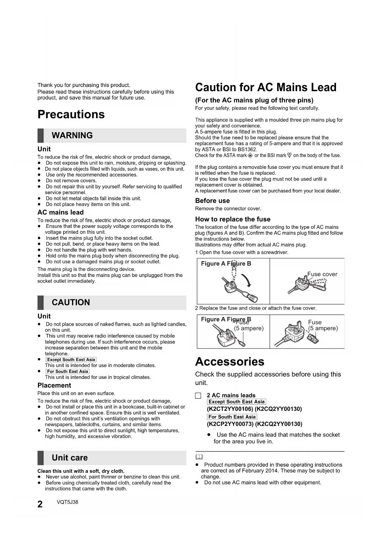 unit. ∏ 2 AC mains leads [Except\South\East\Asia](K2CT2YY00106) (K2CQ2YY00130)[For\South\East\Asia](K2CP2YY00073) (K2CQ2YY00130)≥ Use the AC mains lead that matches the socket for the area you live in. ≥ Product numbers provided in these operating instructions are correct as of February 2014. These may be subject to change.≥ Do not use AC mains lead with other equipment.