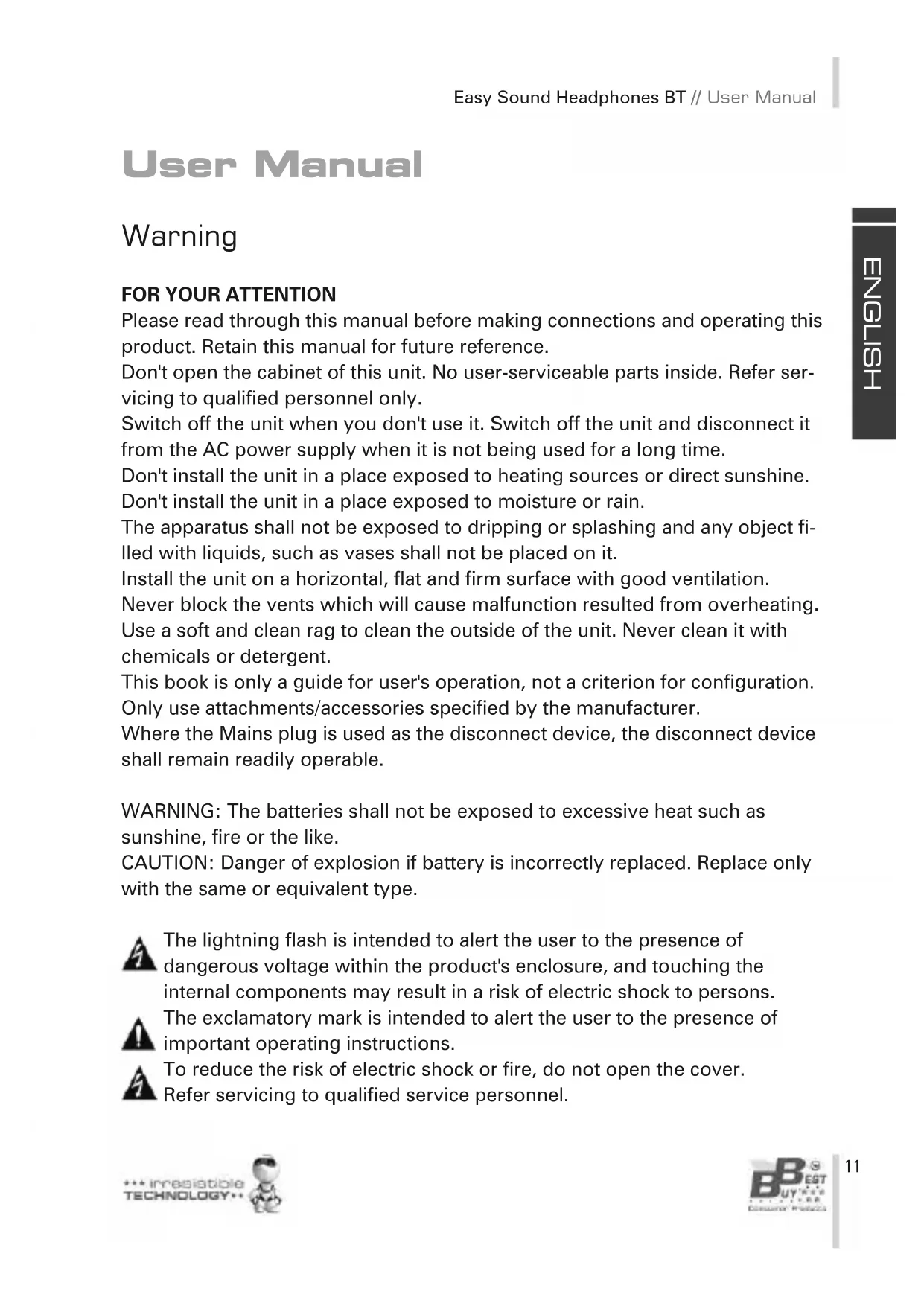 sunshine, fire or the like. CAUTION: Danger of explosion if battery is incorrectly replaced. Replace only with the same or equivalent type. The lightning flash is intended to alert the user to the presence of dangerous voltage within the product's enclosure, and touching the internal components may result in a risk of electric shock to persons. The exclamatory mark is intended to alert the user to the presence of important operating instructions. To reduce the risk of electric shock or fire, do not open the cover. Refer servicing to qualified service personnel.E N G L I S H User Manual // Easy Sound Headphones BT