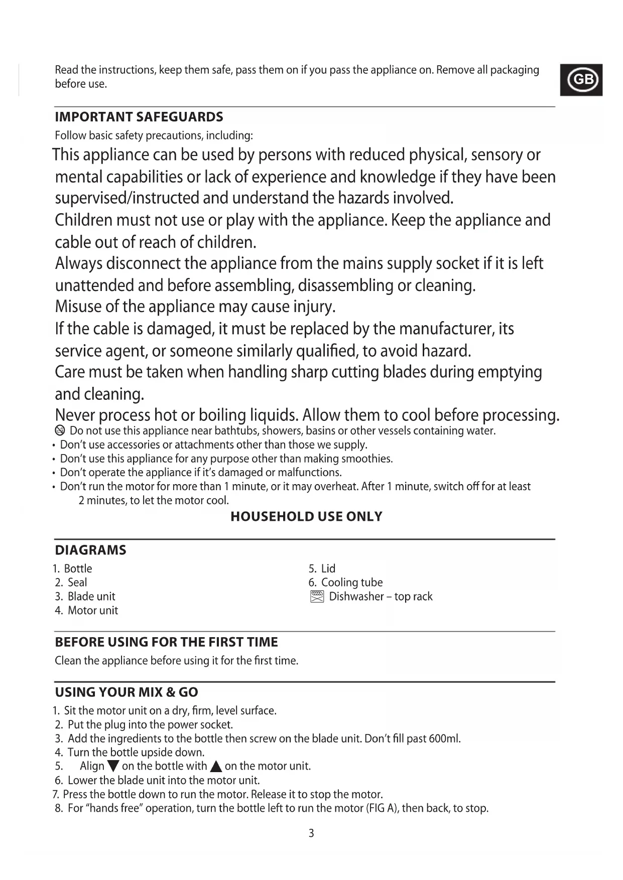 Read the instructions, keep them safe, pass them on if you pass the appliance on. Remove all packaging before use. IMPORTANT SAFEGUARDS Follow basic safety precautions, including: This appliance can be used by persons with reduced physical, sensory or mental capabilities or lack of experience and knowledge if they have been supervised/instructed and understand the hazards involved. Children must not use or play with the appliance. Keep the appliance and cable out of reach of children. Always disconnect the appliance from the mains supply socket if it is left unattended and before assembling, disassembling or cleaning. Misuse of the appliance may cause injury. If the cable is damaged, it must be replaced by the manufacturer, its service agent, or someone similarly qualified, to avoid hazard. Care must be taken when handling sharp cutting blades during emptying and cleaning. Never process hot or boiling liquids. Allow them to cool before processing. b Do not use this appliance near bathtubs, showers, basins or other vessels containing water.