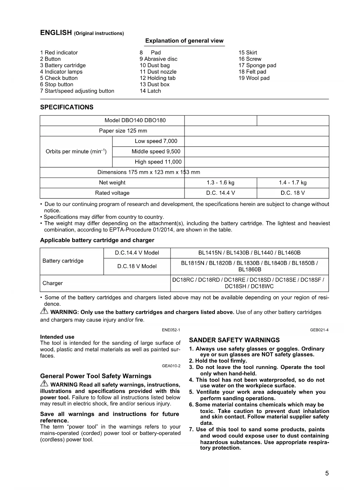 (cordless) power tool. GEB021-4 SANDER SAFETY WARNINGS
