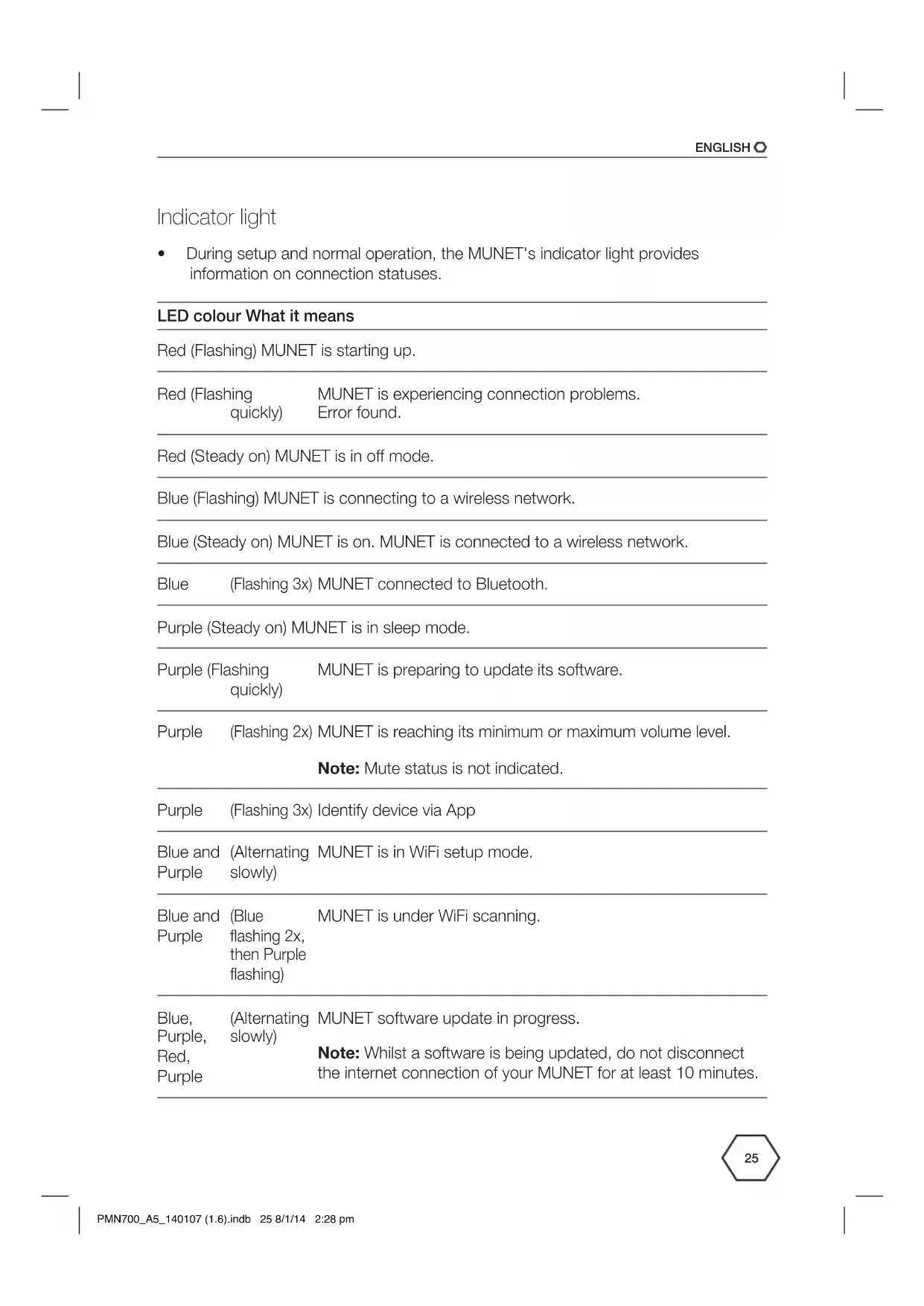 - During setup and normal operation, the MUNET's indicator light provides information on connection statuses. LED colour What it means Red (Flashing) MUNET is starting up. Red (Flashing quickly) MUNET is experiencing connection problems. Error found. Red (Steady on) MUNET is in off mode. Blue (Flashing) MUNET is connecting to a wireless network. Blue (Steady on) MUNET is on. MUNET is connected to a wireless network. Blue (Flashing 3x) MUNET connected to Bluetooth. Purple (Steady on) MUNET is in sleep mode. Purple (Flashing quickly) MUNET is preparing to update its software. Purple (Flashing 2x) MUNET is reaching its minimum or maximum volume level. Note: Mute status is not indicated. Purple (Flashing 3x) Identify device via App Blue and Purple (Alternating slowly) MUNET is in WiFi setup mode. Blue and Purple (Blue flashing 2x, then Purple flashing) MUNET is under WiFi scanning. Blue, Purple, Red, Purple (Alternating slowly) MUNET software update in progress. Note: Whilst a software is being updated, do not disconnect the internet connection of your MUNET for at least 10 minutes. PMN700_A5_140107 (1.6).indb 25 8/1/14 2:28 pmENGLISH