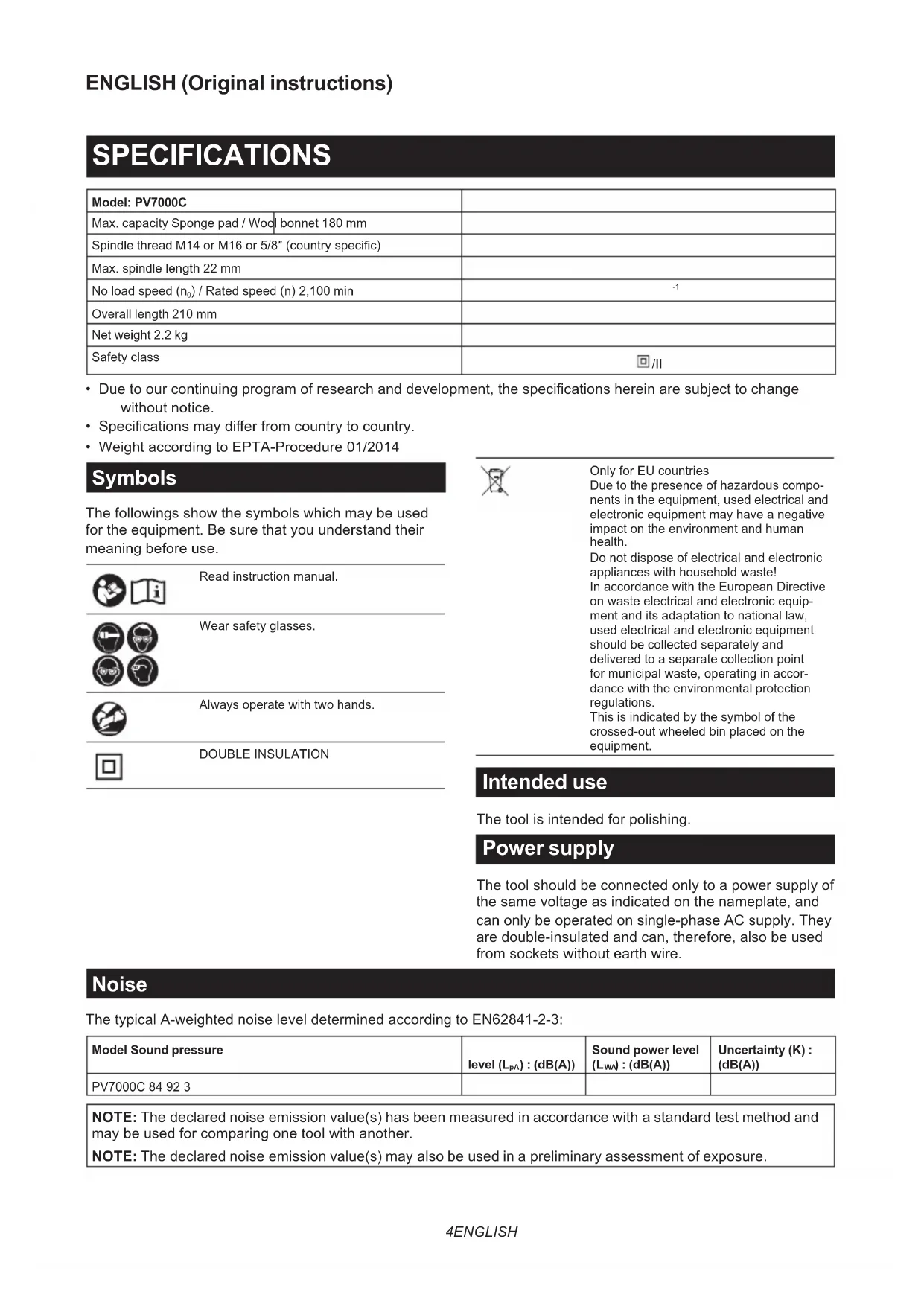 ) PV7000C 2.5 m/s 2 or less 1.5 NOTE: The declared vibration total value(s) has been measured in accordance with a standard test method and