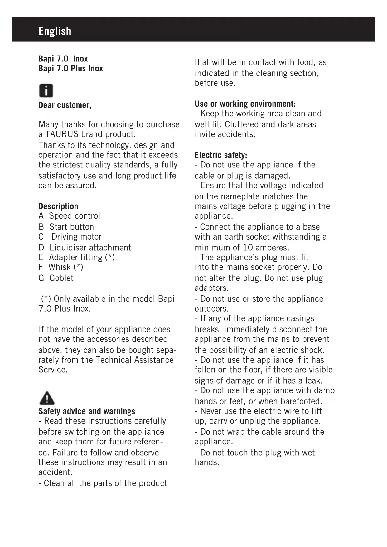 Bapi 7.0 Plus Inox - Blender TAURUS - Free user manual and instructions
