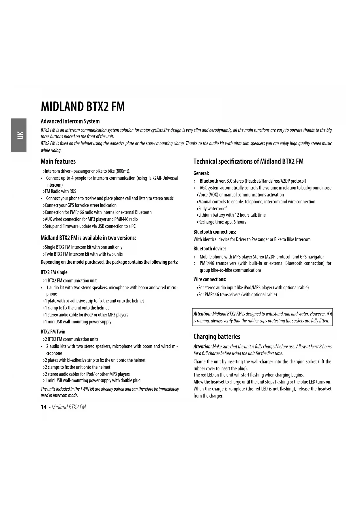› PMR446 transceivers (with built-in or external Bluetooth connection) for group bike-to-bike communications Wire connections: › For stereo audio input like iPod/MP3 player (with optional cable) › For PMR446 transceivers (with optional cable)Attention: Midland BTX2 FM is designed to withstand rain and water. However, if it is raining, always verify that the rubber caps protecting the sockets are fully fitted. Charging batteries