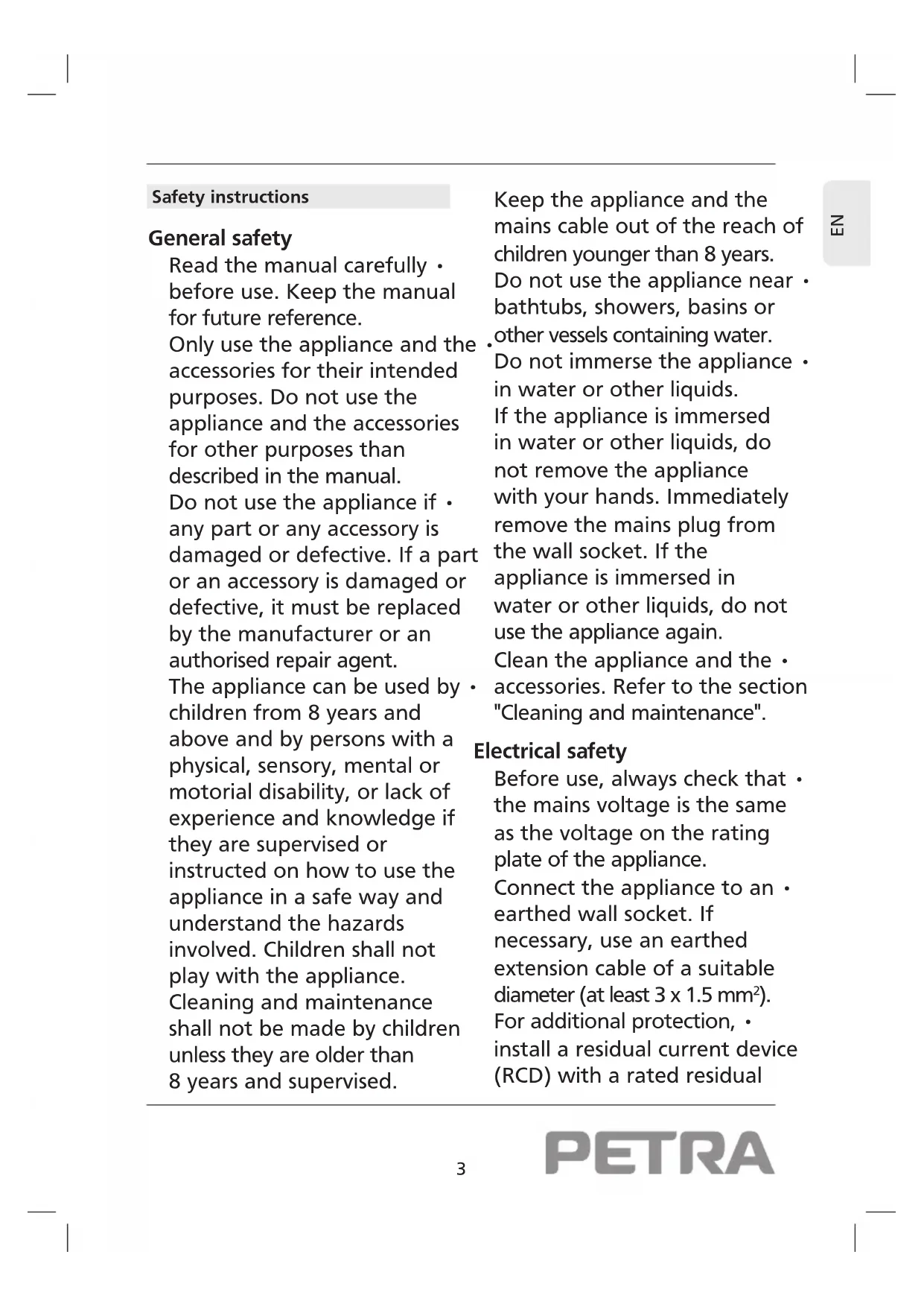 Safety instructions General safety Read the manual carefully • before use. Keep the manual for future reference. Only use the appliance and the • accessories for their intended purposes. Do not use the appliance and the accessories for other purposes than described in the manual. Do not use the appliance if • any part or any accessory is damaged or defective. If a part or an accessory is damaged or defective, it must be replaced by the manufacturer or an authorised repair agent. The appliance can be used by • children from 8 years and above and by persons with a physical, sensory, mental or motorial disability, or lack of experience and knowledge if they are supervised or instructed on how to use the appliance in a safe way and understand the hazards involved. Children shall not play with the appliance. Cleaning and maintenance shall not be made by children unless they are older than 8 years and supervised. Keep the appliance and the mains cable out of the reach of children younger than 8 years. Do not use the appliance near • bathtubs, showers, basins or other vessels containing water. Do not immerse the appliance • in water or other liquids. If the appliance is immersed in water or other liquids, do not remove the appliance with your hands. Immediately remove the mains plug from the wall socket. If the appliance is immersed in water or other liquids, do not use the appliance again. Clean the appliance and the • accessories. Refer to the section "Cleaning and maintenance". Electrical safety Before use, always check that • the mains voltage is the same as the voltage on the rating plate of the appliance. Connect the appliance to an • earthed wall socket. If necessary, use an earthed extension cable of a suitable diameter (at least 3 x 1.5 mm