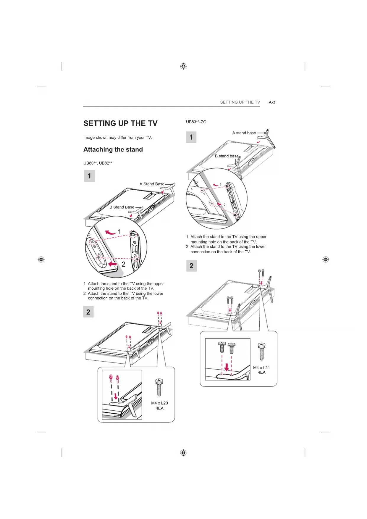 1 Attach the stand to the TV using the upper