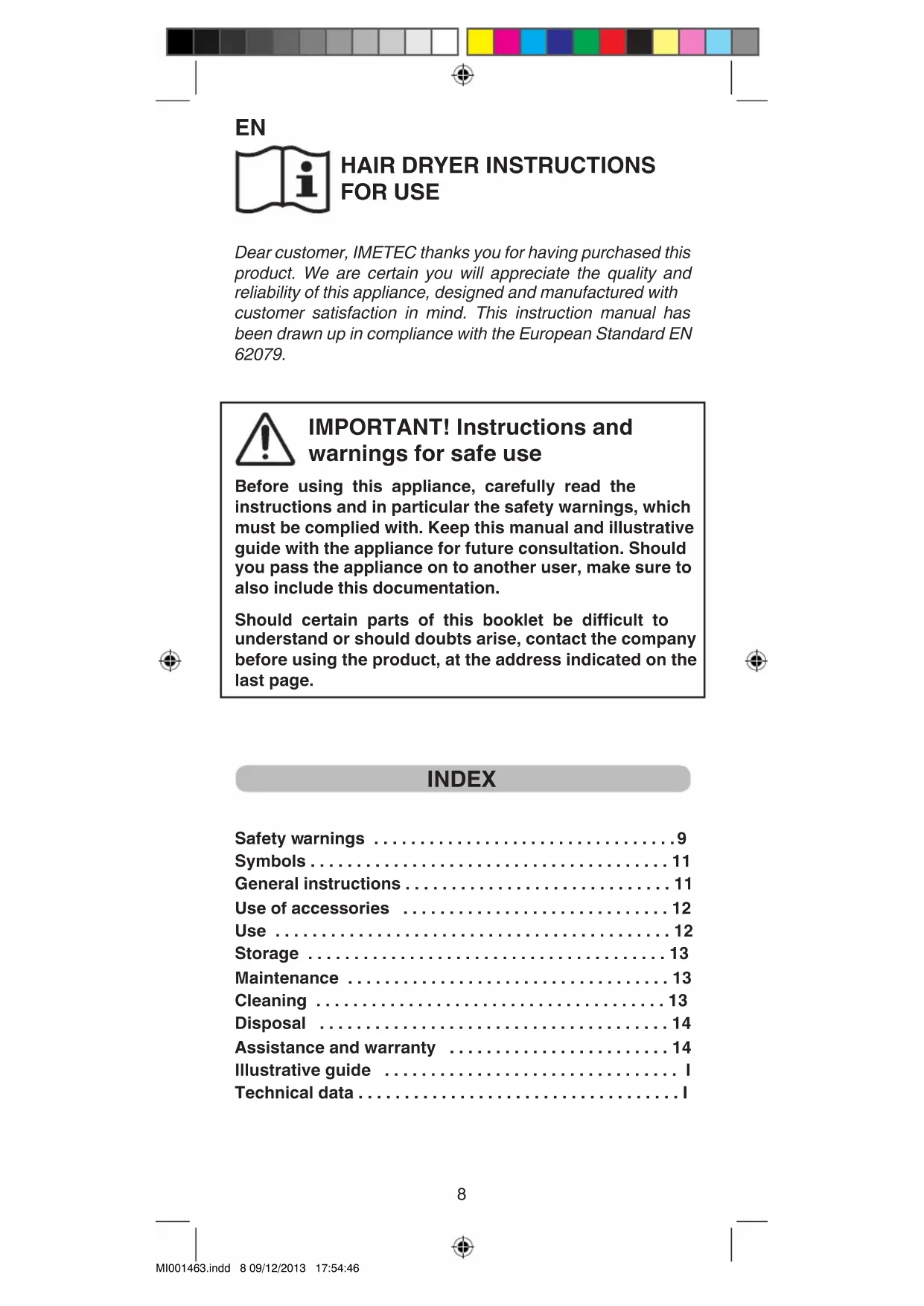 HAIR DRYER INSTRUCTIONS FOR USE Dear customer, IMETEC thanks you for having purchased this