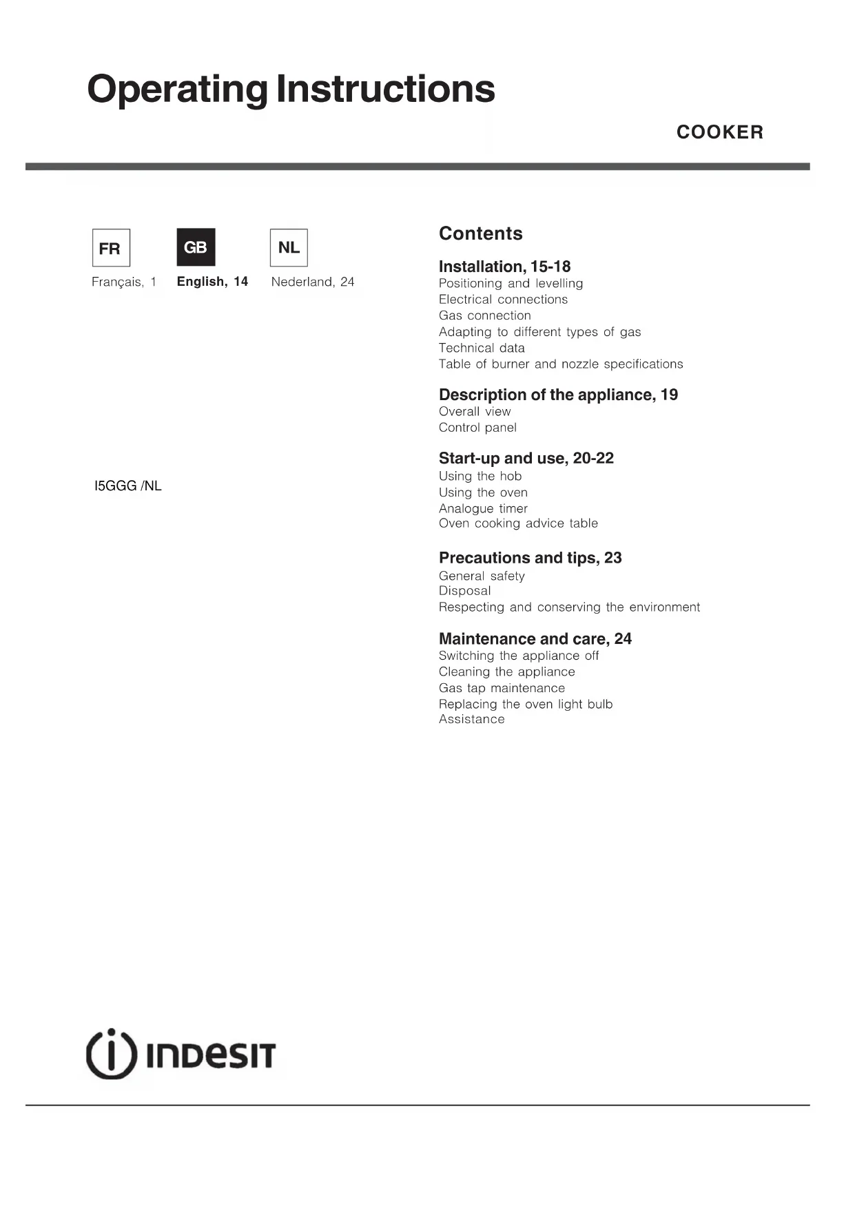 I5GGG(W)NL - Cooker INDESIT - Free user manual and instructions