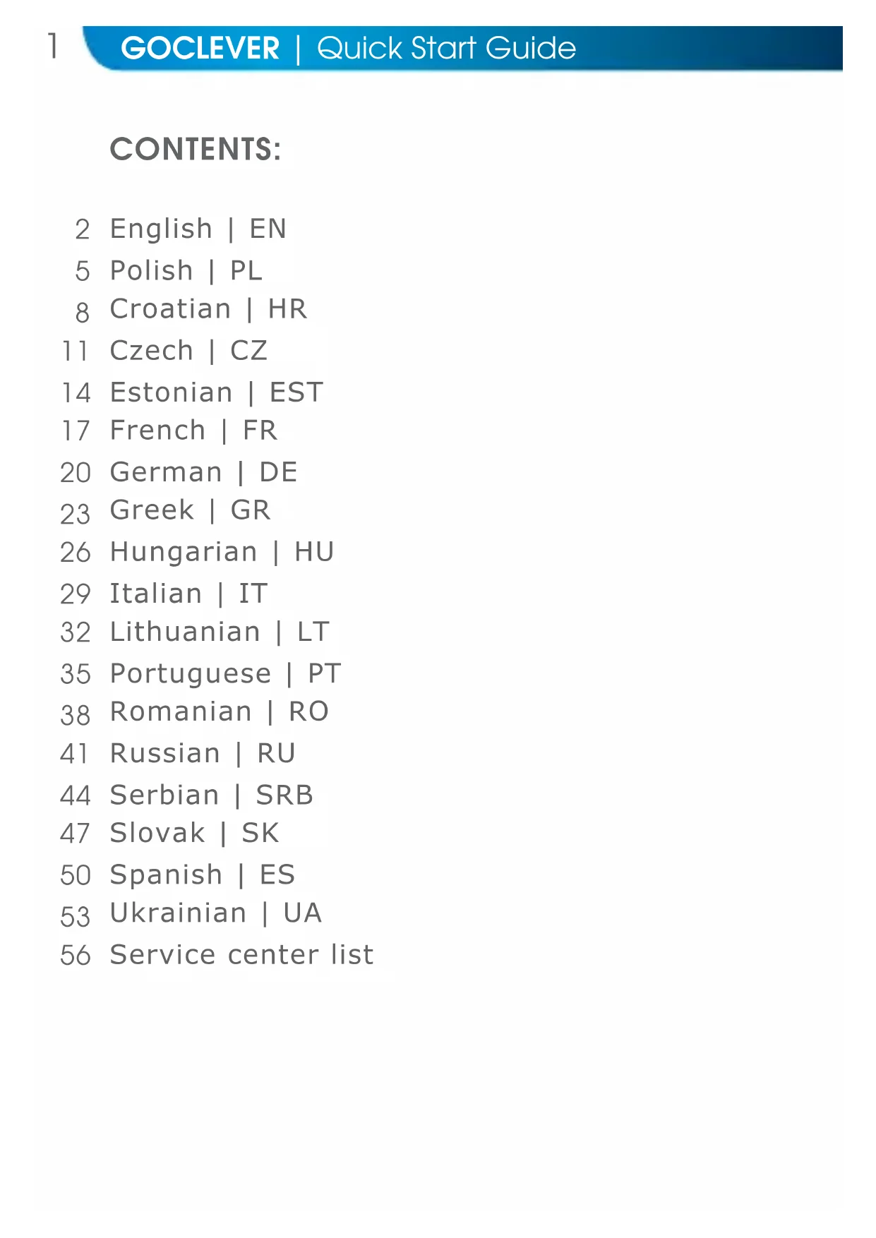 CONTENTS: English | EN Polish | PL Croatian | HR Czech | CZ Estonian | EST French | FR German | DE Greek | GR Hungarian | HU Italian | IT Lithuanian | LT Portuguese | PT Romanian | RO Russian | RU Serbian | SRB Slovak | SK Spanish | ES Ukrainian | UA Service center list