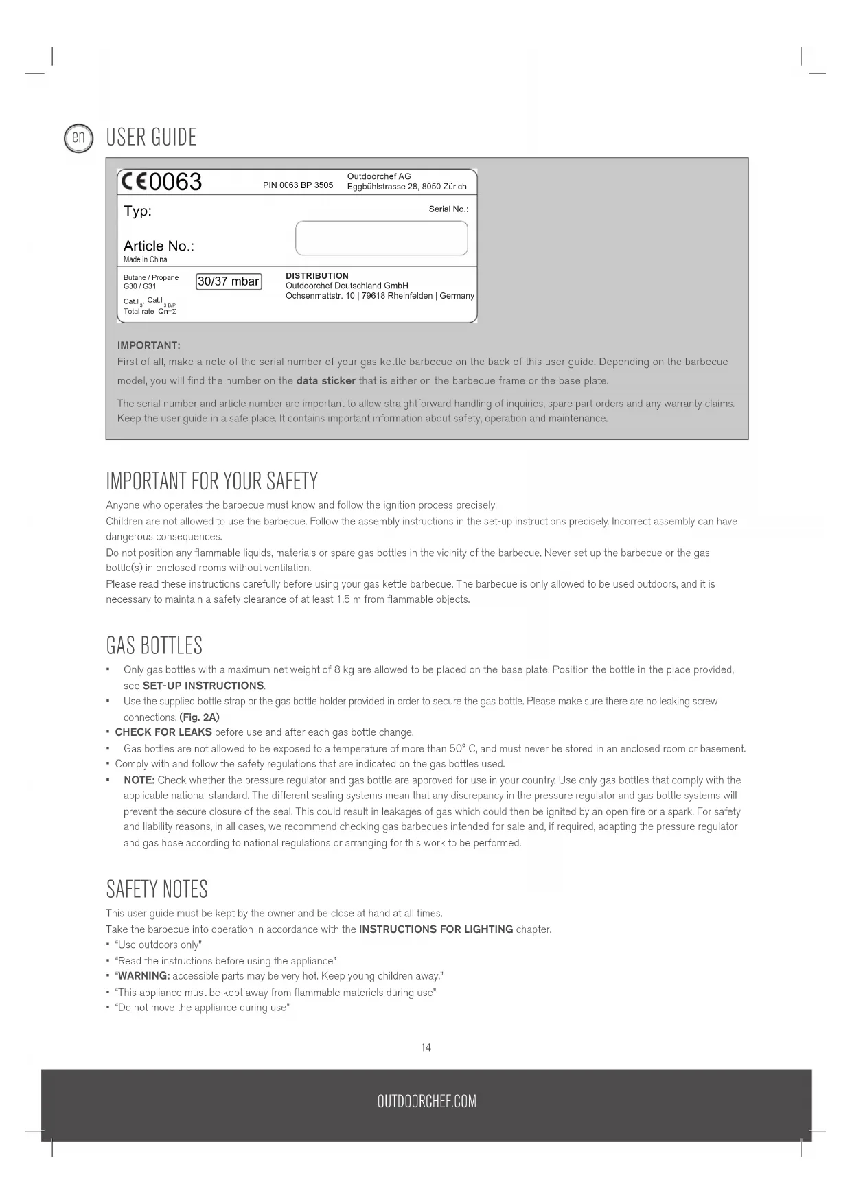 - “Do not move the appliance during use” IMPORTANT: First of all, make a note of the serial number of your gas kettle barbecue on the back of this user guide. Depending on the barbecue model, you will find the number on the data sticker that is either on the barbecue frame or the base plate. The serial number and article number are important to allow straightforward handling of inquiries, spare part orders and any warranty claims. Keep the user guide in a safe place. It contains important information about safety, operation and maintenance. Total rate Qn=Σ Typ: PIN 0063 BP 3505Outdoorchef AGEggbühlstrasse 28, 8050 Zürich