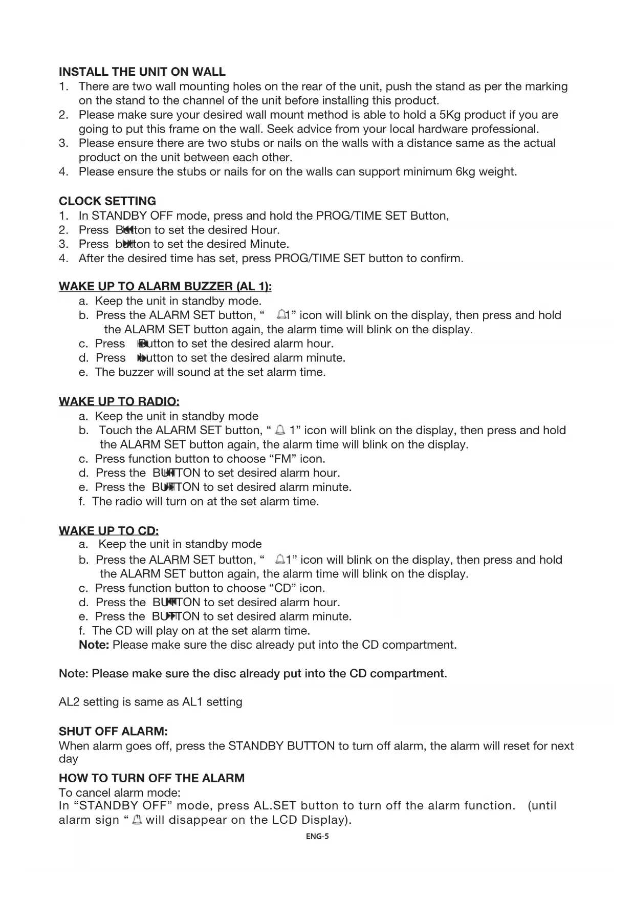 WAKE UP TO ALARM BUZZER (AL 1): a. Keep the unit in standby mode. b. Press the ALARM SET button, “ 1” icon will blink on the display, then press and hold the ALARM SET button again, the alarm time will blink on the display. c. Press Button to set the desired alarm hour. d. Press button to set the desired alarm minute. e. The buzzer will sound at the set alarm time. WAKE UP TO RADIO: a. Keep the unit in standby mode b. Touch the ALARM SET button, “ 1” icon will blink on the display, then press and hold the ALARM SET button again, the alarm time will blink on the display. c. Press function button to choose “FM” icon. d. Press the BUTTON to set desired alarm hour. e. Press the BUTTON to set desired alarm minute. f. The radio will turn on at the set alarm time. WAKE UP TO CD: a. Keep the unit in standby mode b. Press the ALARM SET button, “ 1” icon will blink on the display, then press and hold the ALARM SET button again, the alarm time will blink on the display. c. Press function button to choose “CD” icon. d. Press the BUTTON to set desired alarm hour. e. Press the BUTTON to set desired alarm minute. f. The CD will play on at the set alarm time. Note: Please make sure the disc already put into the CD compartment. Note: Please make sure the disc already put into the CD compartment. AL2 setting is same as AL1 setting SHUT OFF ALARM: When alarm goes off, press the STANDBY BUTTON to turn off alarm, the alarm will reset for next day