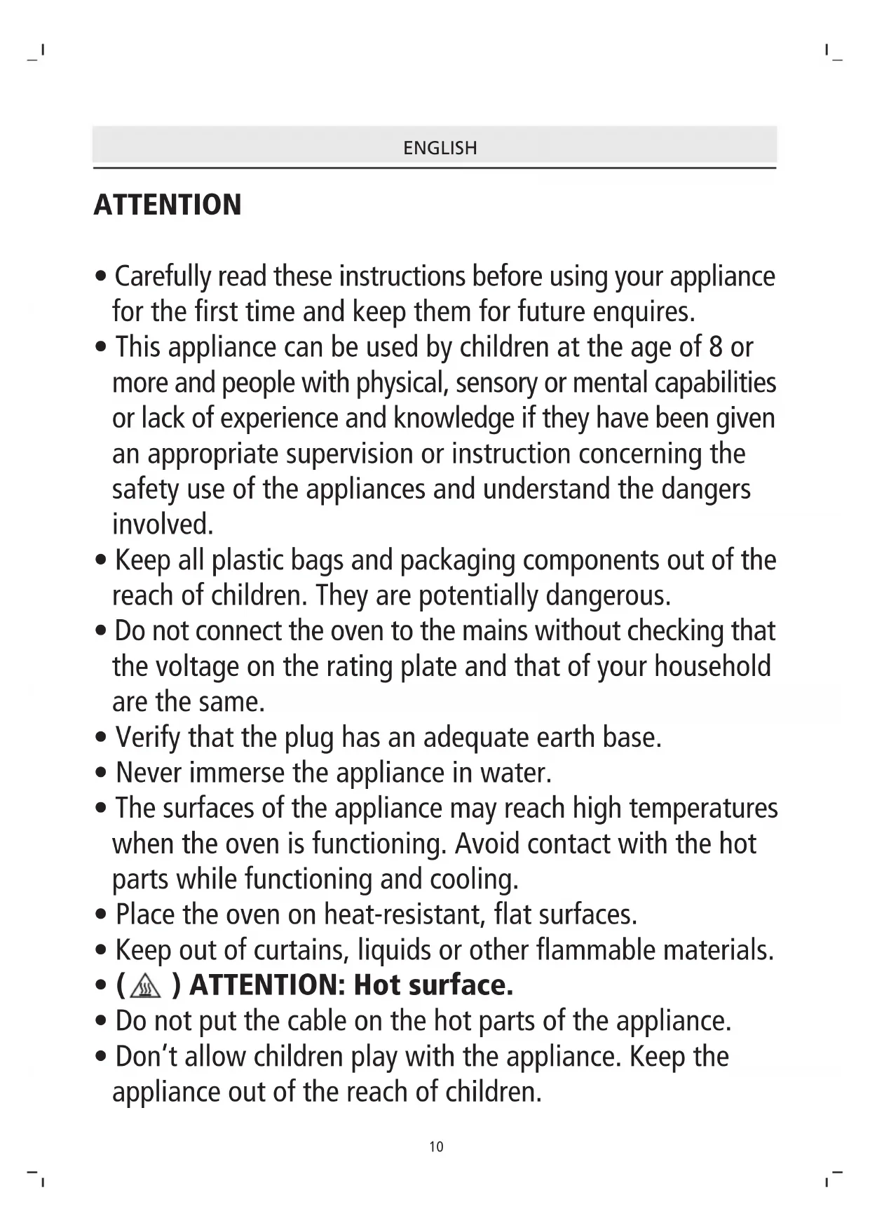- Keep the appliance and the cable cord out of the reach of children less than 8 years old.