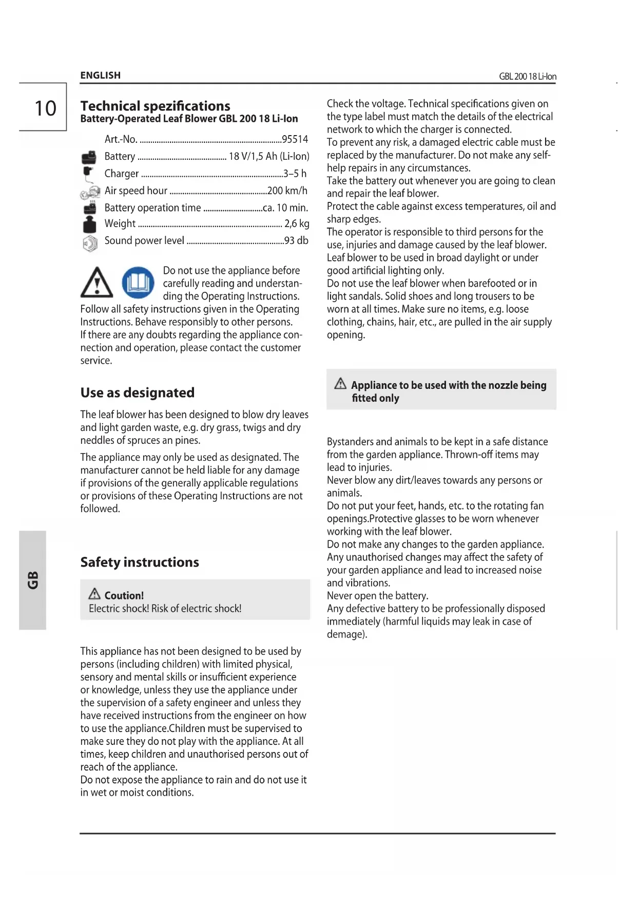 Do not use the appliance before carefully reading and understan- ding the Operating Instructions. Follow all safety instructions given in the Operating Instructions. Behave responsibly to other persons. If there are any doubts regarding the appliance con- nection and operation, please contact the customer service. Use as designated The leaf blower has been designed to blow dry leaves and light garden waste, e.g. dry grass, twigs and dry neddles of spruces an pines. The appliance may only be used as designated. The manufacturer cannot be held liable for any damage if provisions of the generally applicable regulations or provisions of these Operating Instructions are not followed. Safety instructions Coution! Electric shock! Risk of electric shock! This appliance has not been designed to be used by persons (including children) with limited physical, sensory and mental skills or insucient experience or knowledge, unless they use the appliance under the supervision of a safety engineer and unless they have received instructions from the engineer on how to use the appliance.Children must be supervised to make sure they do not play with the appliance. At all times, keep children and unauthorised persons out of reach of the appliance. Do not expose the appliance to rain and do not use it in wet or moist conditions. Check the voltage. Technical specications given on the type label must match the details of the electrical network to which the charger is connected. To prevent any risk, a damaged electric cable must be replaced by the manufacturer. Do not make any self- help repairs in any circumstances. Take the battery out whenever you are going to clean and repair the leaf blower. Protect the cable against excess temperatures, oil and sharp edges. The operator is responsible to third persons for the use, injuries and damage caused by the leaf blower. Leaf blower to be used in broad daylight or under good articial lighting only. Do not use the leaf blower when barefooted or in light sandals. Solid shoes and long trousers to be worn at all times. Make sure no items, e.g. loose clothing, chains, hair, etc., are pulled in the air supply opening. Appliance to be used with the nozzle being tted only Bystanders and animals to be kept in a safe distance from the garden appliance. Thrown-o items may lead to injuries. Never blow any dirt/leaves towards any persons or animals. Do not put your feet, hands, etc. to the rotating fan openings.Protective glasses to be worn whenever working with the leaf blower. Do not make any changes to the garden appliance. Any unauthorised changes may aect the safety of your garden appliance and lead to increased noise and vibrations. Never open the battery. Any defective battery to be professionally disposed immediately (harmful liquids may leak in case of demage). Technical spezications Battery-Operated Leaf Blower GBL 200 18 Li-Ion Art.-No. ...................................................................95514 Battery .......................................... 18 V/1,5 Ah (Li-Ion) Charger ...................................................................3–5 h Air speed hour ..............................................200 km/h Battery operation time ............................ca. 10 min. Weight .................................................................... 2,6 kg Sound power level ..............................................93 db11 GBL 200 18 Li-Ion ENGLISH