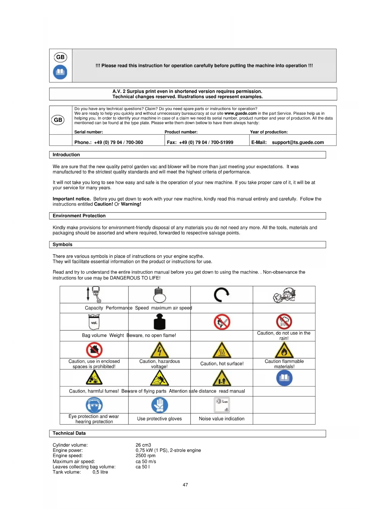 Phone.: +49 (0) 79 04 / 700-360 Fax: +49 (0) 79 04 / 700-51999 E-Mail: support@ts.guede.com Introduction We are sure that the new quality petrol garden vac and blower will be more than just meeting your expectations. It was manufactured to the strictest quality standards and will meet the highest criteria of performance. It will not take you long to see how easy and safe is the operation of your new machine. If you take proper care of it, it will be at your service for many years. Important notice. Before you get down to work with your new machine, kindly read this manual entirely and carefully. Follow the instructions entitled Caution! Or Warning! Environment Protection Kindly make provisions for environment-friendly disposal of any materials you do not need any more. All the tools, materials and packaging should be assorted and where required, forwarded to respective salvage points. Symbols There are various symbols in place of instructions on your engine scythe. They will facilitate essential information on the product or instructions for use. Read and try to understand the entire instruction manual before you get down to using the machine. . Non-observance the instructions for use may be DANGEROUS TO LIFE!