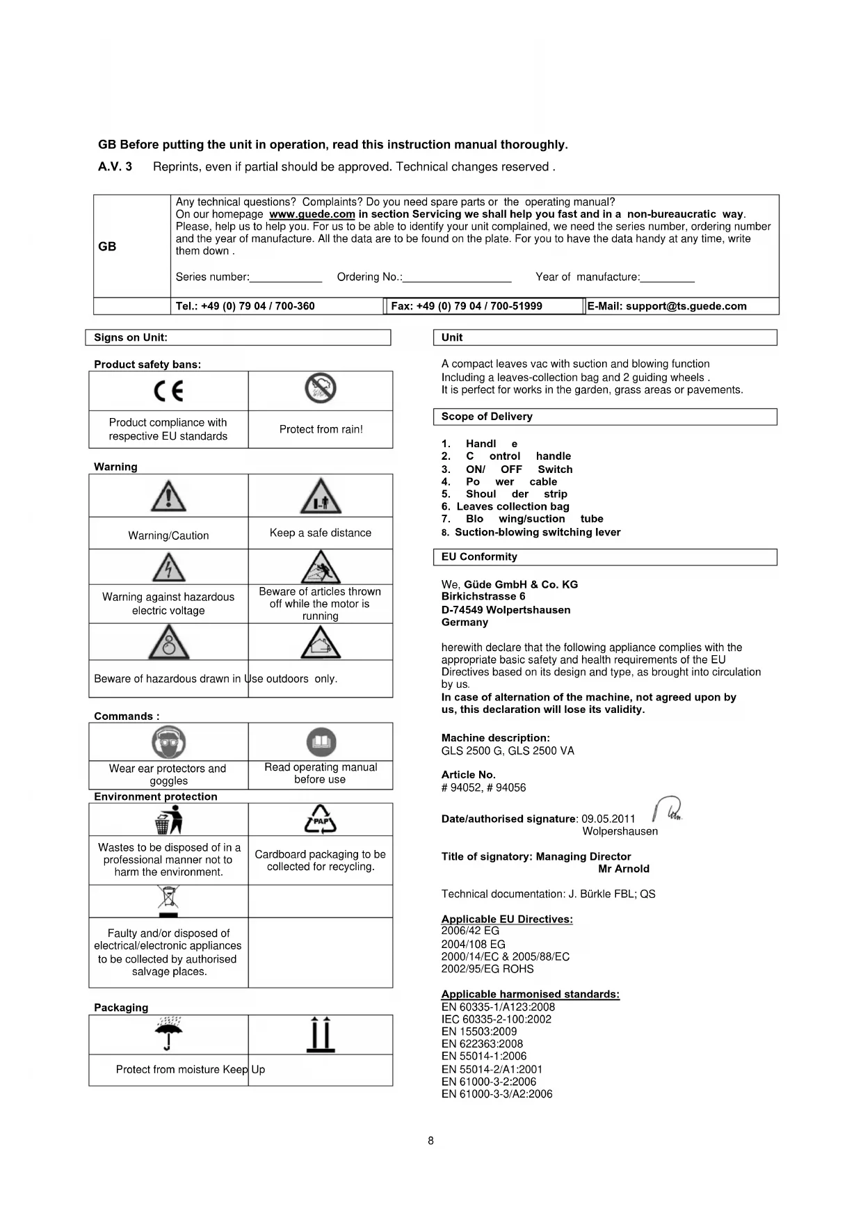 Any technical questions? Complaints? Do you need spare parts or the operating manual? On our homepage www.guede.com in section Servicing we shall help you fast and in a non-bureaucratic way. Please, help us to help you. For us to be able to identify your unit complained, we need the series number, ordering number and the year of manufacture. All the data are to be found on the plate. For you to have the data handy at any time, write them down . Series number:____________ Ordering No.:__________________ Year of manufacture:_________ Tel.: +49 (0) 79 04 / 700-360 Fax: +49 (0) 79 04 / 700-51999 E-Mail: support@ts.guede.com Signs on Unit: Product safety bans: Product compliance with respective EU standards Protect from rain! Warning Warning/Caution Keep a safe distance Warning against hazardous electric voltage Beware of articles thrown off while the motor is running Beware of hazardous drawn in Use outdoors only. Commands : Wear ear protectors and goggles Read operating manual before use Environment protection Wastes to be disposed of in a professional manner not to harm the environment. Cardboard packaging to be collected for recycling. Faulty and/or disposed of electrical/electronic appliances to be collected by authorised salvage places. Packaging Protect from moisture Keep Up Unit A compact leaves vac with suction and blowing function Including a leaves-collection bag and 2 guiding wheels . It is perfect for works in the garden, grass areas or pavements. Scope of Delivery