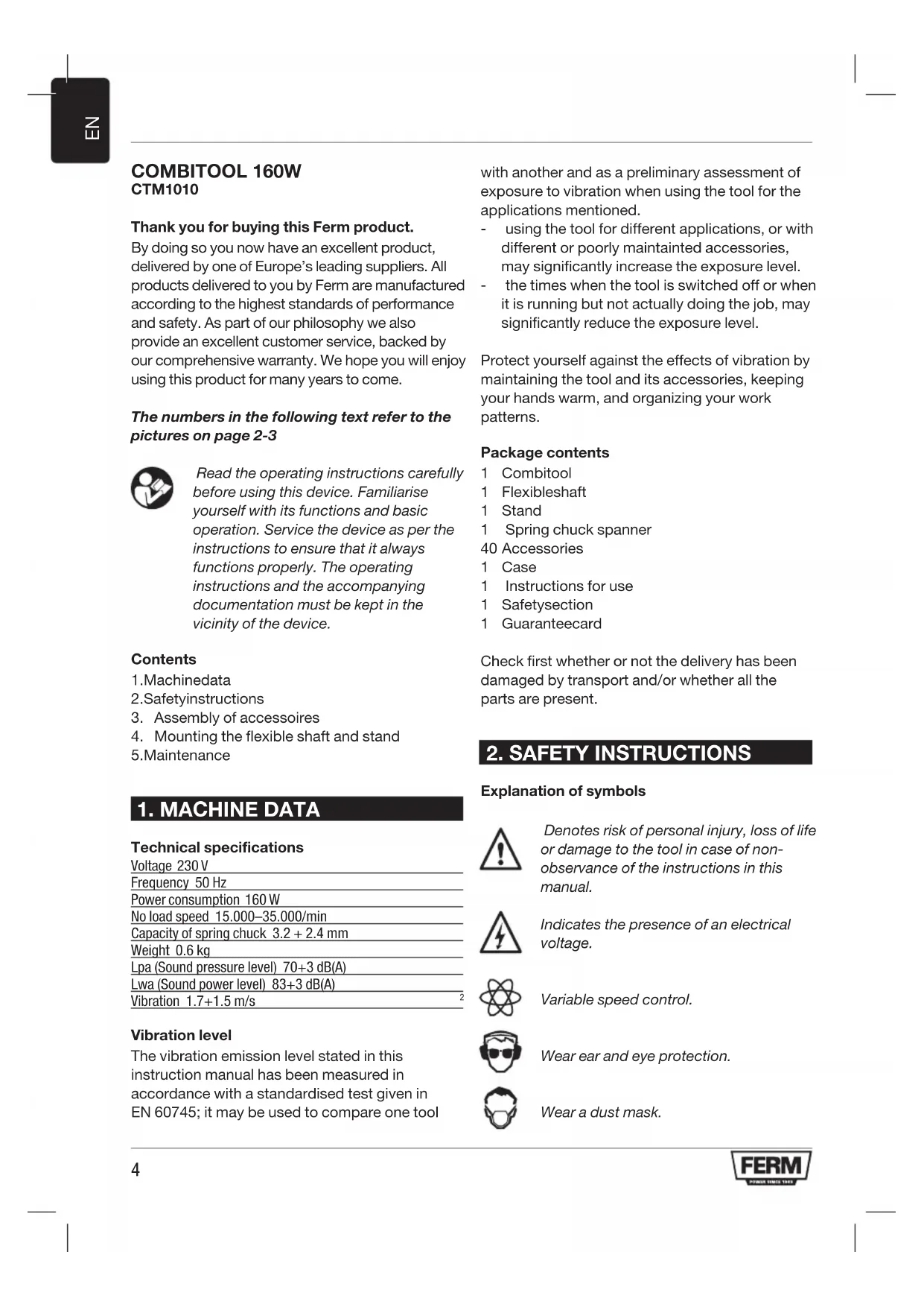 COMBITOOL 160W CTM1010 Thank you for buying this Ferm product. By doing so you now have an excellent product, delivered by one of Europe’s leading suppliers. All products delivered to you by Ferm are manufactured according to the highest standards of performance and safety. As part of our philosophy we also provide an excellent customer service, backed by our comprehensive warranty. We hope you will enjoy using this product for many years to come. The numbers in the following text refer to the pictures on page 2-3 Read the operating instructions carefully before using this device. Familiarise yourself with its functions and basic operation. Service the device as per the instructions to ensure that it always functions properly. The operating instructions and the accompanying documentation must be kept in the vicinity of the device. Contents